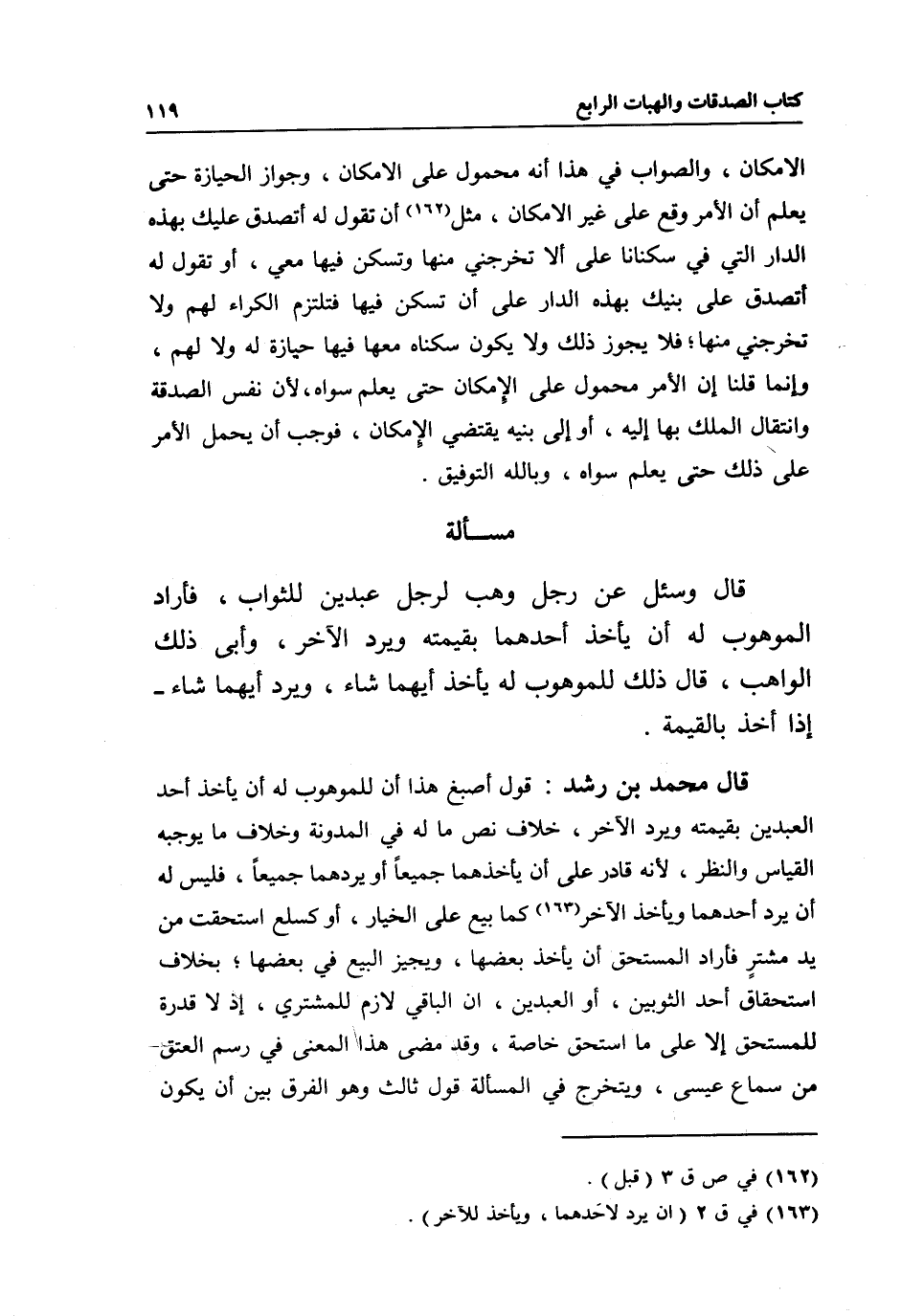الإمكان، والصواب في هذا أنه محمول على الإمكان، وجواز الحيازة حتى يعلم أن الأمر وقع على غير الإمكان، مثل أن تقول له: أتصدق عليك بهذه الدار التي في سكنانا على ألا تخرجني منها، وتسكن فيها معي، أو تقول له: أتصدق على بنيك بهذه الدار على أن تسكن فيها، فتلتزم الكراء لهم، ولا تخرجني منها، فلا يجوز ذلك ولا يكون سكناه معها فيها حيازة له، ولا لهم، وإنما قلنا: إن الأمر محمول على الإمكان حتى يعلم سواه؛ لأن نفس الصدقة وانتقال الملك بها إليه، أو إلى بنيه يقتضي الإمكان، فوجب أن يحمل الأمر على ذلك حتى يعلم سواه، وبالله التوفيق.