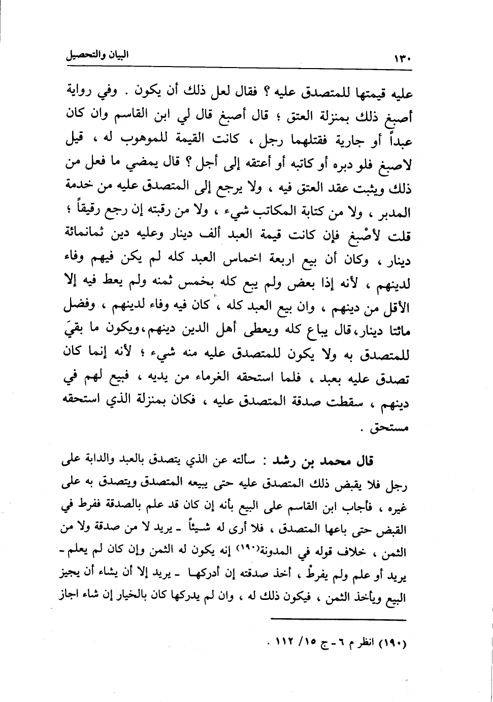 قال محمد بن رشد: سألته عن الذي يتصدق بالعبد والدابة على رجل، فلا يقبض ذلك المتصدق عليه حتى يبيعه المتصدق ويتصدق به على غيره، فأجاب ابن القاسم على البيع بأنه إن كان قد علم بالصدقة، ففرط في القبض حتى باعها المتصدق، فلا أرى له شيئا يريد لا من صدقة ولا من الثمن، خلاف قوله في المدونة: إنه يكون له الثمن، وإن كان لم يعلم يريد، أو علم ولم يفرط، أخذ صدقته إن أدركها، يريد إلا أن يشاء أن يجيز البيع، ويأخذ الثمن، فيكون ذلك له، وإن لم يدركها كان بالخيار، إن شاء أجاز