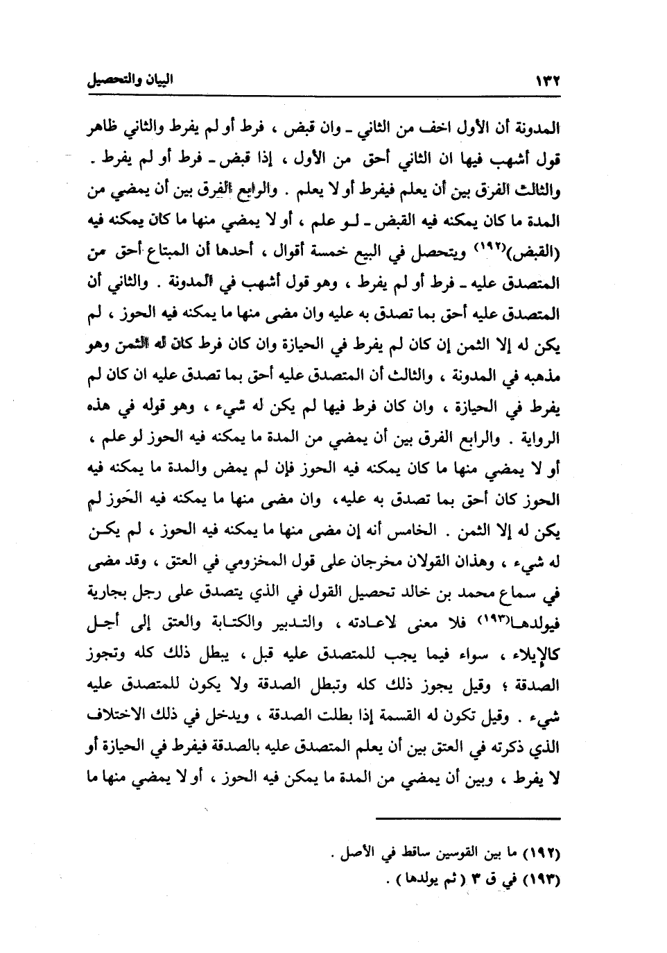 والثاني: أن المتصدق عليه أحق بما تصدق به عليه وإن مضى منها ما يمكنه فيه الحوز، لم يكن له إلا الثمن إن كان لم يفرط في الحيازة وإن كان فرط كان له الثمن وهو مذهبه في المدونة، والثالث: أن المتصدق عليه أحق بما تصدق عليه إن كان لم يفرط في الحيازة، وإن كان فرط فيها لم يكن له شيء، وهو قوله في هذه الرواية. والرابع: الفرق بين أن يمضي من المدة ما يمكنه فيه الحوز لو علم، أو لا يمضي منها ما كان يمكنه فيه الحوز فإن لم يمض والمدة ما يمكنه فيه الحوز كان أحق بما تصدق به عليه، وإن مضى منها ما يمكنه فيه الحوز لم يكن له إلا الثمن. الخامس: أنه إن مضى منها ما يمكنه فيه الحوز، لم يكن له شيء، وهذان القولان مخرجان على قول المخزومي في العتق، وقد مضى في سماع محمد بن خالد تحصيل القول في الذي يتصدق على رجل بجارية فيولدها فلا معنى لإعادته، والتدبير والكتابة والعتق إلى أجل كالإيلاء، سواء فيما يجب للمتصدق عليه قبل، يبطل ذلك كله وتجوز الصدقة؛ وقيل: يجوز ذلك كله وتبطل الصدقة ولا يكون للمتصدق عليه شيء. وقيل تكون له القسمة إذا بطلت الصدقة، ويدخل في ذلك الاختلاف الذي ذكرته في العتق بين أن يعلم المتصدق عليه بالصدقة فيفرط في الحيازة أو لا يفرط، وبين أن يمضي من المدة ما يمكن فيه الحوز، أو لا يمضي منها ما