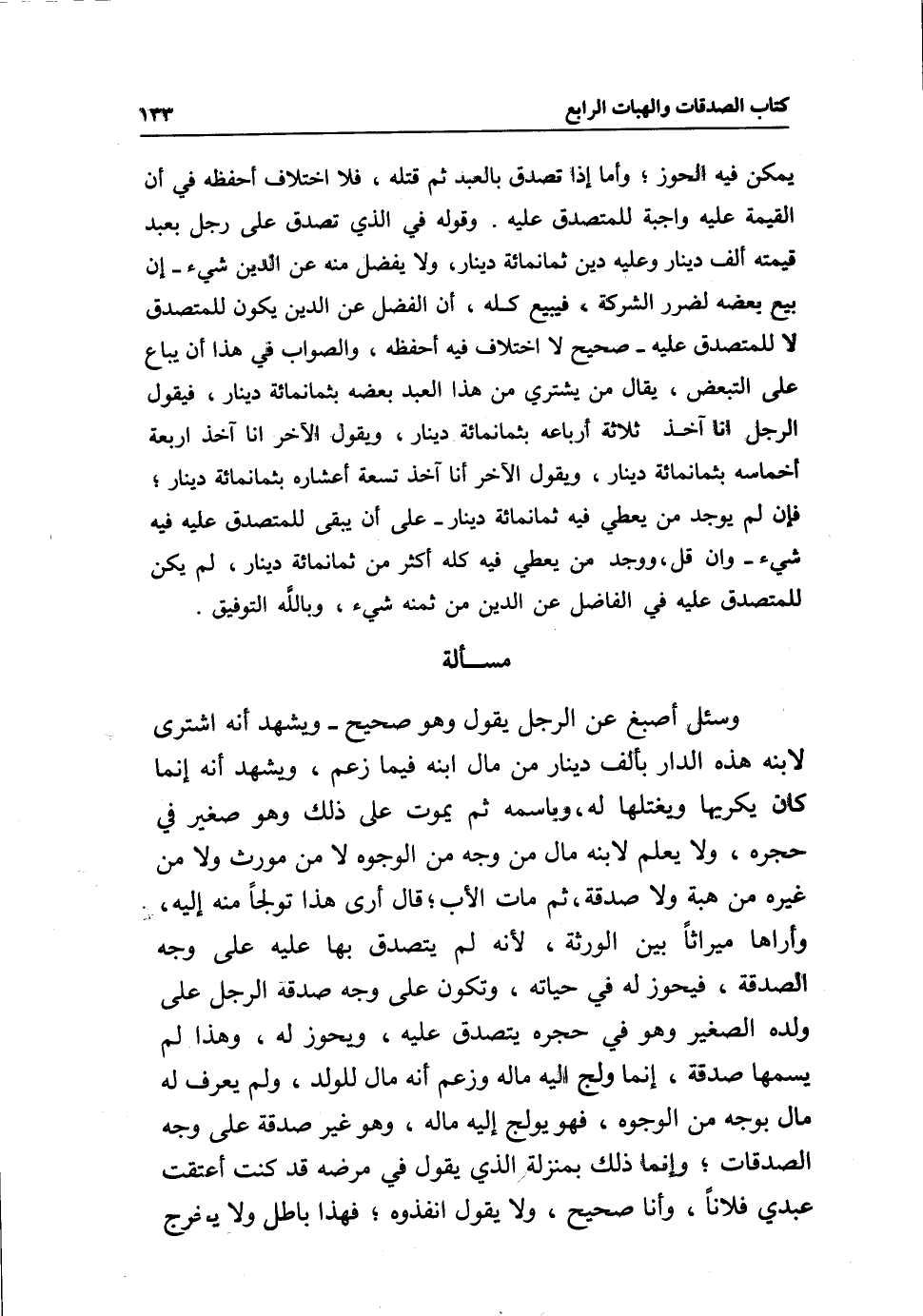 يمكن فيه الحوز؛ وأما إذا تصدق بالعبد ثم قتله، فلا اختلاف أحفظه في أن القيمة عليه واجبة للمتصدق عليه. وقوله في الذي تصدق على رجل بعبد قيمته ألف دينار وعليه دين ثمانمائة دينار، ولا يفضل منه عن الدين شيء- إن بيع بعضه لضرر الشركة، فيبيع كله، أن الفضل عن الدين يكون للمتصدق لا للمتصدق عليه- صحيح لا اختلاف فيه أحفظه، والصواب في هذا أن يباع على التبعض، يقال: من يشتري من هذا العبد بعضه بثمانمائة دينار، فيقول الرجل أنا آخذ ثلاثة أرباعه بثمانمائة دينار، ويقول الآخر أنا آخذ أربعة أخماسه بثمانمائة دينار، ويقول الآخر أنا آخذ تسعة أعشاره بثمانمائة دينار؛ فإن لم يوجد من يعطي فيه ثمانمائة دينار- على أن يبقى للمتصدق عليه فيه شيء- وإن قل، ووجد من يعطي فيه كله أكثر من ثمانمائة دينار، لم يكن للمتصدق عليه في الفاضل عن الدين من ثمنه شيء، وبالله التوفيق.