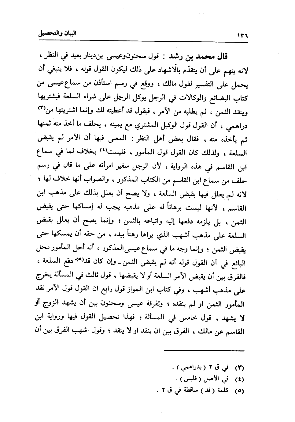 قال محمد بن رشد: قول سحنون وعيسى بن دينار بعيد في النظر؛ لأنه يتهم على أن يتقدم بالإشهاد على ذلك ليكون القول قوله، فلا ينبغي أن يحمل على التفسير لقول مالك، ووقع في رسم استأذن من سماع عيسى من كتاب البضائع والوكالات في الرجل يوكل الرجل على شراء السلعة فيشتريها وينقد الثمن، ثم يطلبه من الآمر، فيقول قد أعطيته لك وإنما اشتريتها من دراهمي، أن القول قول الوكيل المشتري مع يمينه، يحلف ما أخذ منه ثمنها ثم يأخذه منه، فقال بعض أهل النظر: المعنى فيها أن الآمر لم يقبض السلعة، ولذلك كان القول قول المأمور، فليست بخلاف لما في سماع ابن القاسم في هذه الرواية؛ لأن الرجل سفير امرأته على ما قال في رسم حلف من سماع ابن القاسم من الكتاب المذكور، والصواب أنها خلاف لها؛ لأنه لم يعلل فيها بقبض السلعة، ولا يصح أن يعلل بذلك على مذهب ابن القاسم؛ لأنها ليست برهانا له على مذهبه يجب له إمساكها حتى يقبض الثمن، بل يلزمه دفعها إليه واتباعه بالثمن؛ وإنما يصح أن يعلل بقبض السلعة على مذهب أشهب الذي يراها رهنا بيده، من حقه أن يمسكها حتى يقبض الثمن؛ وإنما وجه ما في سماع عيسى المذكور، أنه أحل المأمور محل البائع في أن القول قوله أنه لم يقبض الثمن - وإن كان قد دفع السلعة، فالفرق بين أن يقبض الآمر السلعة أو لا يقبضها، قول ثالث في المسألة يخرج على مذهب أشهب، وفي كتاب ابن المواز قول رابع: أن القول قول الآمر نقد المأمور الثمن أو لم ينقده؛ وتفرقة عيسى وسحنون بين أن يشهد الزوج أو لا يشهد، قول خامس في المسألة؛ فهذا تحصيل القول فيها ورواية ابن القاسم عن مالك، الفرق بين أن ينقد أو لا ينقد، وقول أشهب الفرق بين أن