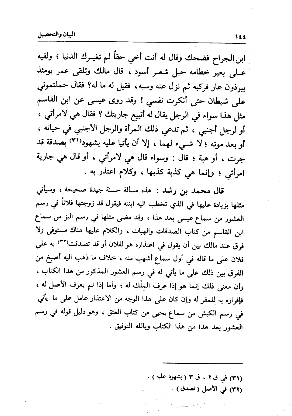 ابن الجراح فضحك وقال له أنت أخي حقا لم تغيرك الدنيا؛ ولقيه على بعير خطامه حبل شعر أسود، قال مالك وتلقى عمر يومئذ ببرذون عار فركبه ثم نزل عنه وسبه، فقيل له: ما له؟ فقال حملتموني على شيطان حتى أنكرت نفسي! وقد روى عيسى عن ابن القاسم مثل هذا سواء في الرجل يقال له أتبيع جاريتك؟ فقال هي لامرأتي، أو لرجل أجنبي، ثم تدعي ذلك المرأة والرجل الأجنبي في حياته، أو بعد موته؛ لا شيء لهما، إلا أن يأتيا عليه بشهود بصدقة قد جرت، أو هبة؛ قال: وسواء قال هي لامرأتي، أو قال هي جارية امرأتي؛ وإنما هي كذبة كذبها، وكلام اعتذر به.