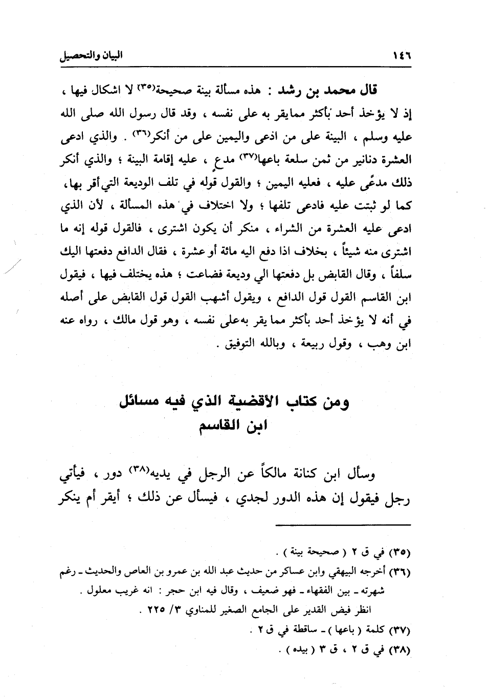 ابن القاسم وسأل ابن كنانة مالكا عن الرجل في يديه دور، فيأتي رجل فيقول إن هذه الدور لجدي، فيسأل عن ذلك؛ أيقر أم ينكر