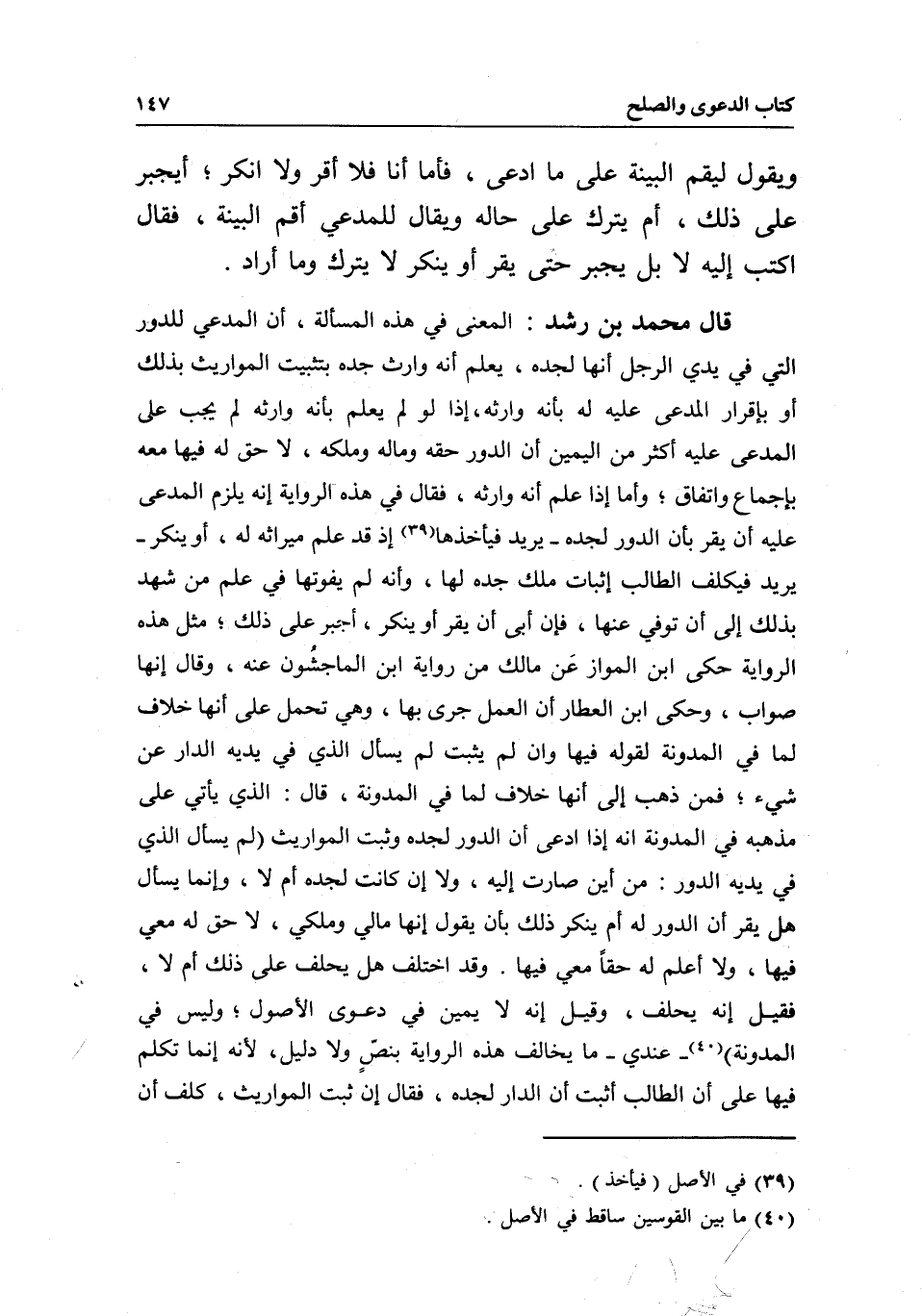 قال محمد بن رشد: المعنى في هذه المسألة، أن المدعي للدور التي في يدي الرجل أنها لجده، يعلم أنه وارث جده بتثبيت المواريث بذلك أو بإقرار المدعى عليه له بأنه وارثه، إذا لو لم يعلم بأنه وارثه لم يجب على المدعى عليه أكثر من اليمين أن الدور حقه وماله وملكه، لا حق له فيها معه بإجماع واتفاق؛ وأما إذا علم أنه وارثه، فقال في هذه الرواية إنه يلزم المدعى عليه أن يقر بأن الدور لجده يريد فيأخذها إذ قد علم ميراثه له، أو ينكر - يريد فيكلف الطالب إثبات ملك جده لها، وأنه لم يفوتها في علم من شهد بذلك إلى أن توفي عنها، فإن أبى أن يقر أو ينكر، أجبر على ذلك؛ مثل هذه الرواية حكى ابن المواز عن مالك من رواية ابن الماجشون عنه، وقال إنها صواب، وحكى ابن العطار أن العمل جرى بها، وهي تحمل على أنها خلاف لما في المدونة لقوله فيها وإن لم يثبت لم يسأل الذي في يديه الدار عن شيء، فمن ذهب إلى أنها خلاف لما في المدونة، قال: الذي يأتي على مذهبه في المدونة أنه إذا ادعى أن الدور لجده وثبت المواريث لم يسأل الذي في يديه الدور: من أين صارت إليه، ولا إن كانت لجده أم لا، وإنما يسأل هل يقر أن الدور له أم ينكر ذلك بأن يقول إنها مالي وملكي، لا حق له معي فيها، ولا أعلم له حقا معي فيها. وقد اختلف هل يحلف على ذلك أم لا، فقيل إنه يحلف، وقيل إنه لا يمين في دعوى الأصول؛ وليس في المدونة) - عندي - ما يخالف هذه الرواية بنص ولا دليل؛ لأنه إنما تكلم فيها على أن الطالب أثبت أن الدار لجده، فقال: إن ثبتت المواريث، كلف أن