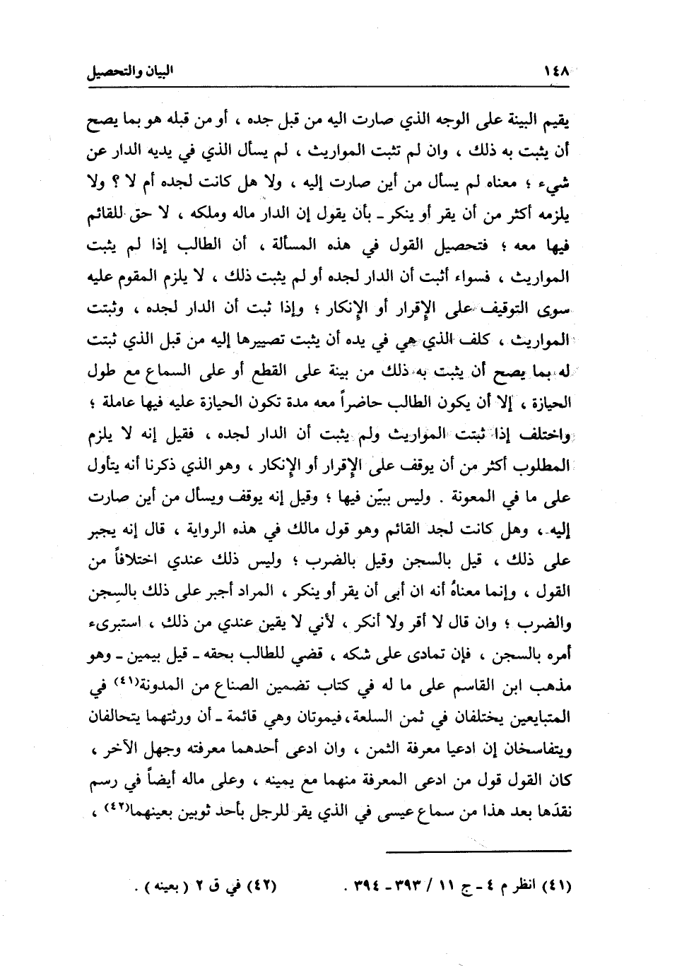 يقيم البينة على الوجه الذي صارت إليه من قبل جده، أو من قبله هو بما يصح أن يثبت به ذلك، وإن لم تثبت المواريث، لم يسأل الذي في يديه الدار عن شيء؛ معناه لم يسأل من أين صارت إليه، ولا هل كانت لجده أم لا؟ ولا يلزمه أكثر من أن يقر أو ينكر- بأن يقول إن الدار ماله وملكه، لا حق للقائم فيها معه؛ فتحصيل القول في هذه المسألة، أن الطالب إذا لم يثبت المواريث، فسواء أثبت أن الدار لجده أو لم يثبت ذلك، لا يلزم المقوم عليه سوى التوقيف على الإقرار أو الإنكار؛ وإذا ثبت أن الدار لجده، وثبتت المواريث، كلف الذي هي في يده أن يثبت تصييرها إليه من قبل الذي ثبتت له بما يصح أن يثبت به ذلك من بينة على القطع أو على السماع مع طول الحيازة، إلا أن يكون الطالب حاضرا معه مدة تكون الحيازة عليه فيها عاملة؛ واختلف إذا ثبتت المواريث ولم يثبت أن الدار لجده، فقيل إنه لا يلزم المطلوب أكثر من أن يوقف على الإقرار أو الإنكار، وهو الذي ذكرنا أنه يتأول على ما في المعونة. وليس ببين فيها؛ وقيل إنه يوقف ويسأل من أين صارت إليه، وهل كانت لجد القائم وهو قول مالك في هذه الرواية، قال: إنه يجبر على ذلك، قيل: بالسجن وقيل: بالضرب؛ وليس ذلك عندي اختلافا من القول، وإنما معناه أنه إن أبى أن يقر أو ينكر، المراد أجبر على ذلك بالسجن والضرب؛ وإن قال لا أقر ولا أنكر؛ لأني لا يقين عندي من ذلك، استبرئ أمره بالسجن، فإن تمادى على شكه، قضي للطالب بحقه- قيل بيمين - وهو مذهب ابن القاسم على ما له في كتاب تضمين الصناع من المدونة في المتبايعين يختلفان في ثمن السلعة، فيموتان وهي قائمة- أن ورثتهما يتحالفان ويتفاسخان إن ادعيا معرفة الثمن، وإن ادعى أحدهما معرفته وجهل الآخر، كان القول قول من ادعى المعرفة منهما مع يمينه، وعلى ماله أيضا في رسم نقدها بعد هذا من سماع عيسى في الذي يقر للرجل بأحد ثوبين بعينهما،