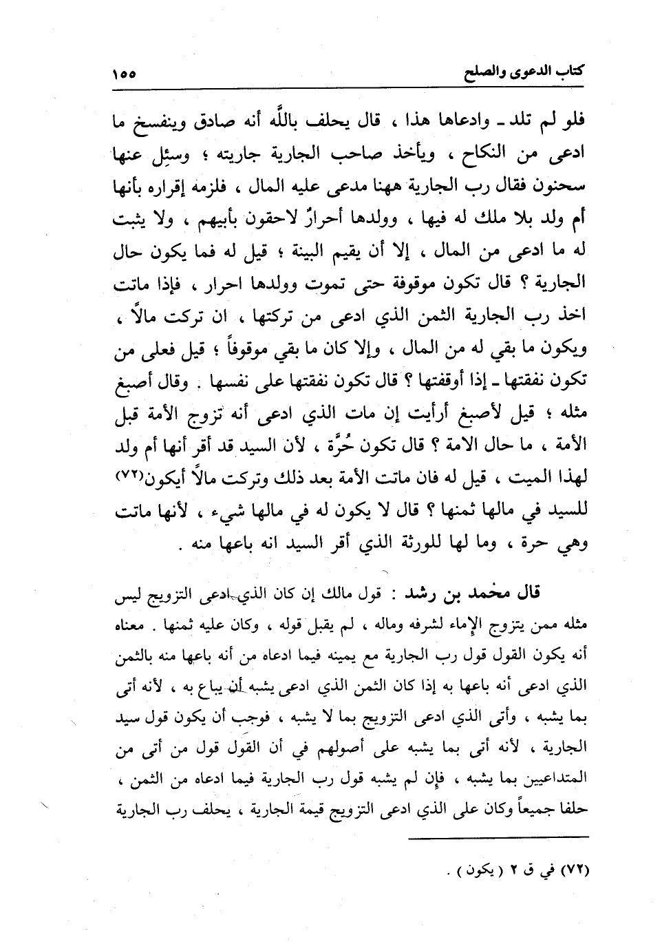 قال محمد بن رشد: قول مالك إن كان الذي ادعى التزويج ليس مثله ممن يتزوج الإماء لشرفه وماله، لم يقبل قوله، وكان عليه ثمنها. معناه أنه يكون القول قول رب الجارية مع يمينه فيما ادعاه من أنه باعها منه بالثمن الذي ادعى أنه باعها به إذا كان الثمن الذي ادعى يشبه أن يباع به؛ لأنه أتى بما يشبه، وأتى الذي ادعى التزويج بما لا يشبه، فوجب أن يكون قول سيد الجارية؛ لأنه أتى بما يشبه على أصولهم في أن القول قول من أتى من المتداعيين بما يشبه، فإن لم يشبه قول رب الجارية فيما ادعاه من الثمن، حلفا جميعا وكان على الذي ادعى التزويج قيمة الجارية، يحلف رب الجارية