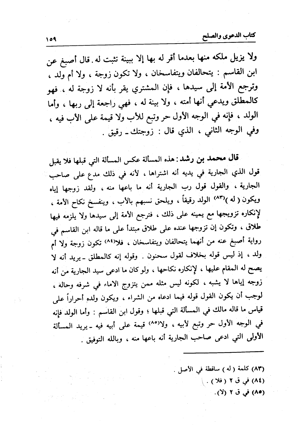 ولا يزيل ملكه منها بعدما أقر له بها إلا ببينة تثبت له. قال أصبغ عن ابن القاسم: يتحالفان ويتفاسخان، ولا تكون زوجة، ولا أم ولد، وترجع الأمة إلى سيدها، فإن المشتري يقر بأنه لا زوجة له، فهو كالمطلق ويدعي أنها أمته، ولا بينة له، فهي راجعة إلي ربها، وأما الولد، فإنه في الوجه الأول حر وتبع للأب ولا قيمة على الأب فيه، وفي الوجه الثاني، الذي قال: زوجتك- رقيق.