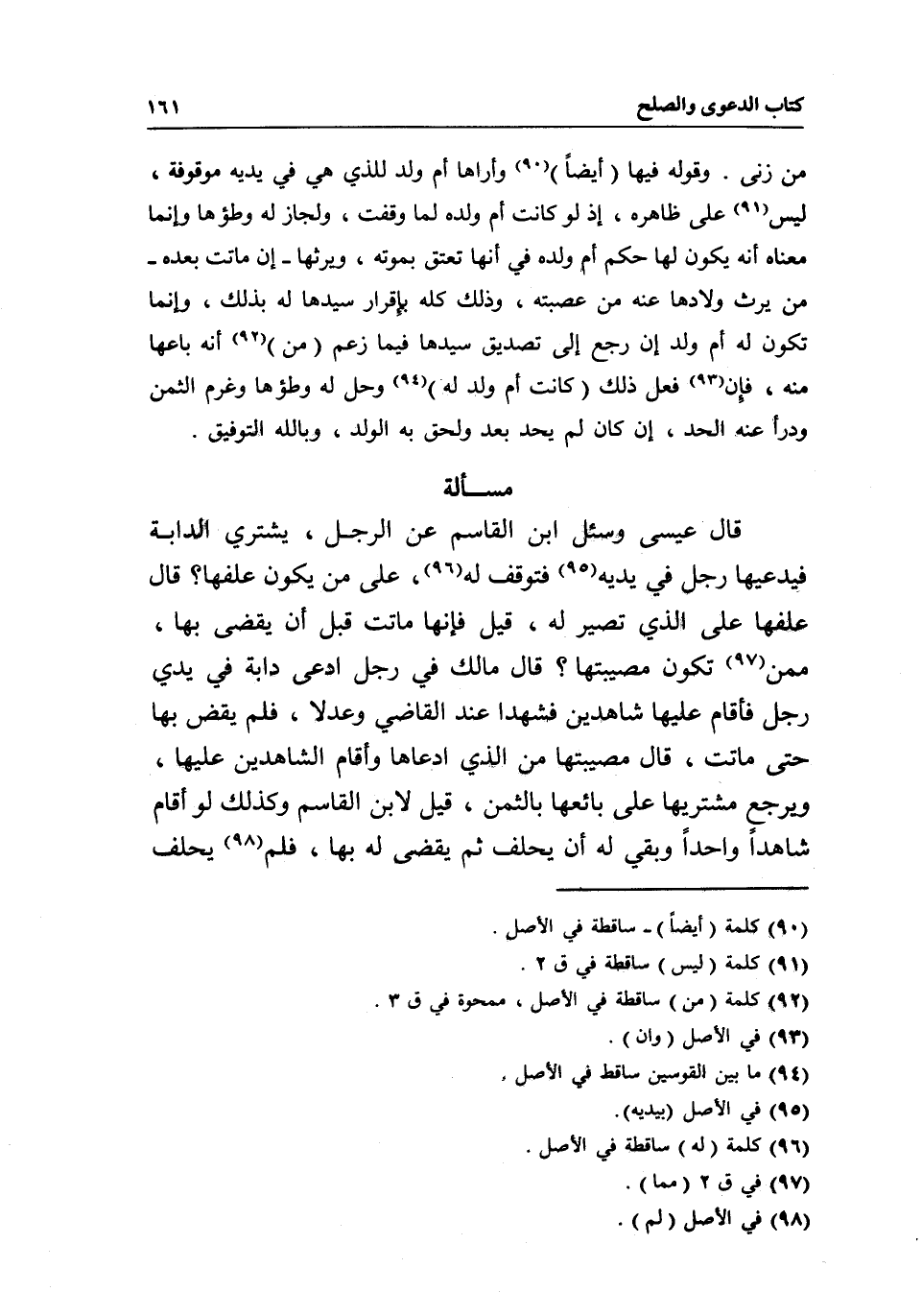 من زنى. وقوله فيها (أيضا) وأراها أم ولد للذي هي في يديه موقوفة، ليس على ظاهره، إذ لو كانت أم ولده لما وقفت، ولجاز له وطؤها وإنما معناه أنه يكون لها حكم أم ولده في أنها تعتق بموته، ويرثها- إن ماتت بعده - من يرث أولادها عنه من عصبته، وذلك كله بإقرار سيدها له بذلك، وإنما تكون له أم ولد إن رجع إلى تصديق سيدها فيما زعم (من) أنه باعها منه، فإن فعل ذلك (كانت أم ولد له) وحل له وطؤها وغرم الثمن ودرأ عنه الحد، إن كان لم يحد بعد ولحق به الولد، وبالله التوفيق.