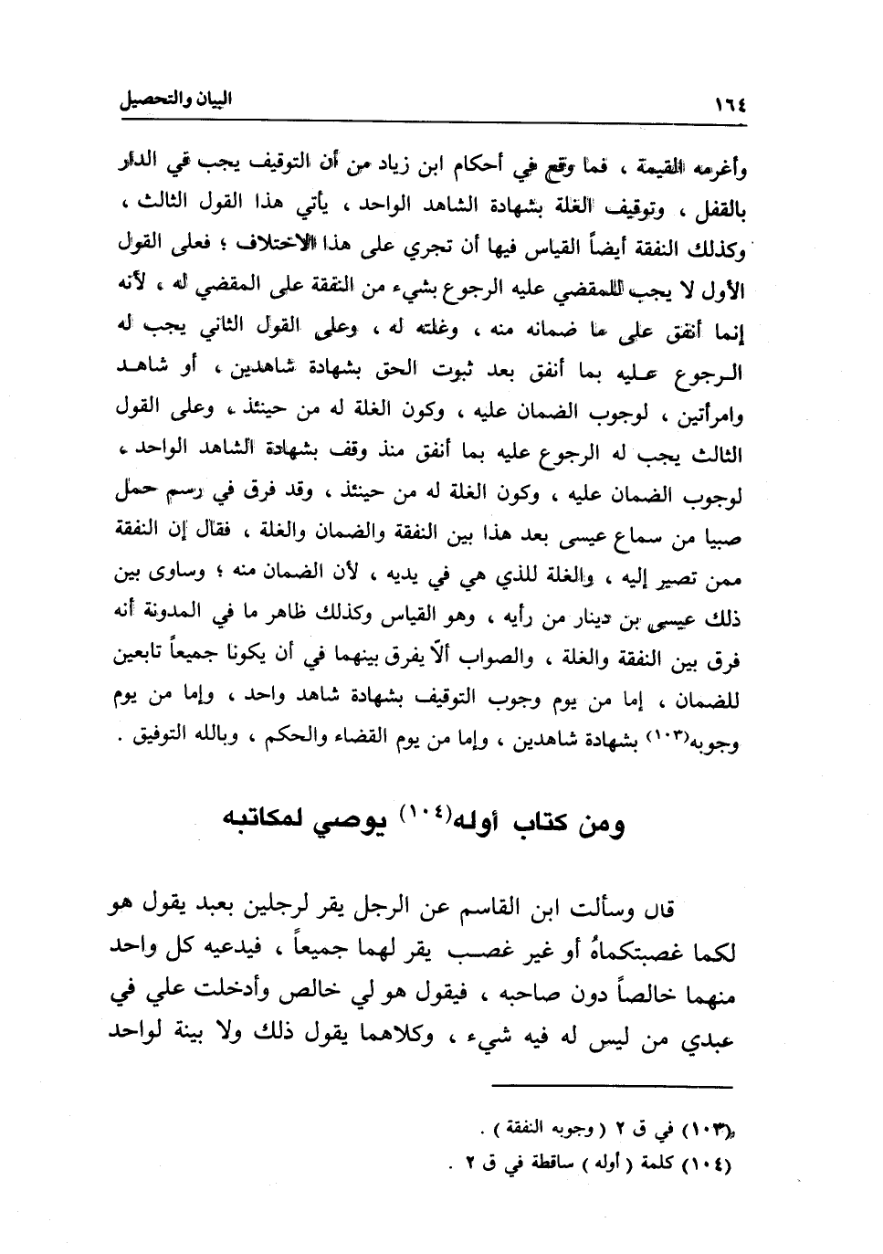 وأغرمه القيمة، فما وقع في أحكام ابن زياد من أن التوقيف يجب في الدار بالقفل، وتوقيف الغلة بشهادة الشاهد الواحد، يأتي هذا القول الثالث، وكذلك النفقة أيضا القياس فيها أن تجري على هذا الاختلاف؛ فعلى القول الأول لا يجب للمقضي عليه الرجوع بشيء من النفقة على المقضي له؛ لأنه إنما أنفق على ما ضمانه منه، وغلته له، وعلى القول الثاني: يجب له الرجوع عليه بما أنفق بعد ثبوت الحق بشهادة شاهدين، أو شاهد وامرأتين، لوجوب الضمان عليه، وكون الغلة له من حينئذ، وعلى القول الثالث: يجب له الرجوع عليه بما أنفق منذ وقف بشهادة الشاهد الواحد، لوجوب الضمان عليه، وكون الغلة له من حينئذ، وقد فرق في رسم حمل صبيا من سماع عيسى بعد هذا بين النفقة والضمان والغلة، فقال إن النفقة ممن تصير إليه، والغلة للذي هي في يديه؛ لأن الضمان منه، وساوى بين ذلك عيسى بن دينار من رأيه، وهو القياس وكذلك ظاهر ما في المدونة أنه فرق بين النفقة والغلة، والصواب ألا يفرق بينهما في أن يكونا جميعا تابعين للضمان، إما من يوم وجوب التوقيف بشهادة شاهد واحد، وإما من يوم وجوبه بشهادة شاهدين، وإما من يوم القضاء والحكم، وبالله التوفيق.