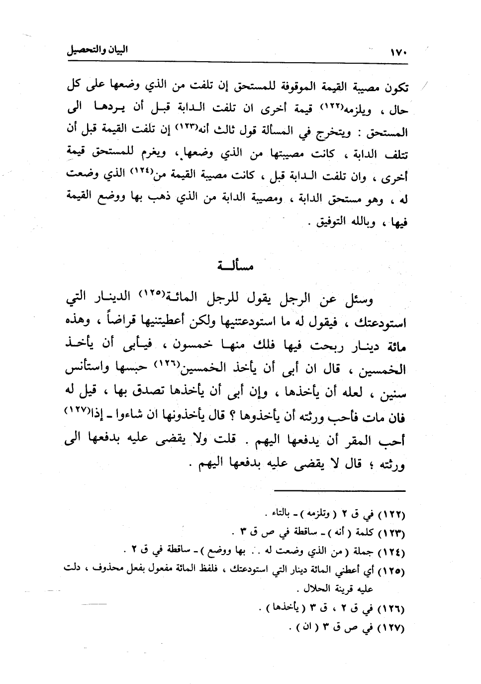 مسألة وسئل عن الرجل يقول للرجل المائة الدينار التي استودعتك، فيقول له: ما استودعتنيها ولكن أعطيتنيها قراضا، وهذه مائة دينار ربحت فيها فلك منها خمسون، فيأبى أن يأخذ الخمسين، قال: إن أبى أن يأخذ الخمسين حبسها واستأنس سنين، لعله أن يأخذها، وإن أبى أن يأخذها تصدق بها، قيل له فإن مات فأحب ورثته أن يأخذوها؛ قال يأخذونها إن شاءوا- إذا أحب المقر أن يدفعها إليهم. قلت ولا يقضى عليه بدفعها إلى ورثته؛ قال لا يقضى عليه بدفعها إليهم.