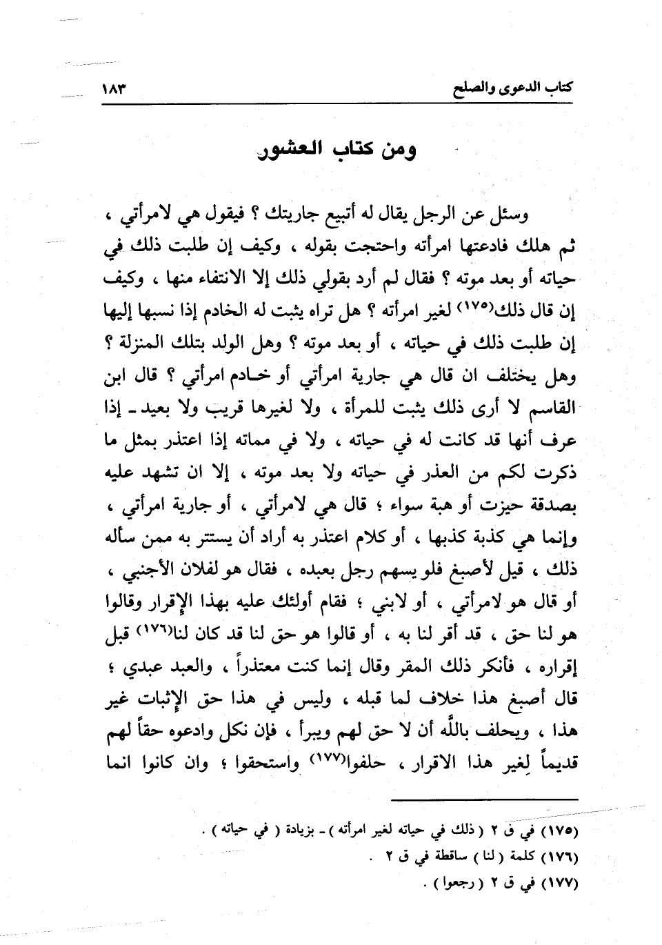 ومن كتاب العشور وسئل عن الرجل يقال له: أتبيع جاريتك؟ فيقول هي لامرأتي، ثم هلك فادعتها امرأته واحتجت بقوله، وكيف إن طلبت ذلك في حياته أو بعد موته؛ فقال: لم أرد بقولي ذلك إلا الانتفاء منها، وكيف إن قال ذلك لغير امرأته؛ هل تراه يثبت له الخادم إذا نسبها إليها إن طلبت ذلك في حياته، أو بعد موته؛ وهل الولد بتلك المنزلة؛ وهل يختلف أن قال هي جارية امرأتي أو خادم امرأتي؟ قال ابن القاسم: لا أرى ذلك يثبت للمرأة، ولا لغيرها قريب ولا بعيد- إذا عرف أنها قد كانت له في حياته، ولا في مماته إذا اعتذر بمثل ما ذكرت لكم من العذر في حياته ولا بعد موته، إلا أن تشهد عليه بصدقة حيزت أو هبة سواء؛ قال هي لامرأتي، أو جارية امرأتي، وإنما هي كذبة كذبها، أو كلام اعتذر به أراد أن يستتر به ممن سأله ذلك، قيل لأصبغ: فلو يسهم رجل بعبده، فقال: هو لفلان الأجنبي، أو قال: هو لامرأتي، أو لابني؛ فقام أولئك عليه بهذا الإقرار وقالوا: هو لنا حق، قد أقر لنا به، أو قالوا: هو حق لنا قد كان لنا قبل إقراره، فأنكر ذلك المقر وقال: إنما كنت معتذرا، والعبد عبدي؛ قال أصبغ: هذا خلاف لما قبله، وليس في هذا حق الإثبات غير هذا، ويحلف بالله أن لا حق لهم ويبرأ، فإن نكل وادعوه حقا لهم قديما لغير هذا الإقرار، حلفوا واستحقوا؛ وإن كانوا إنما