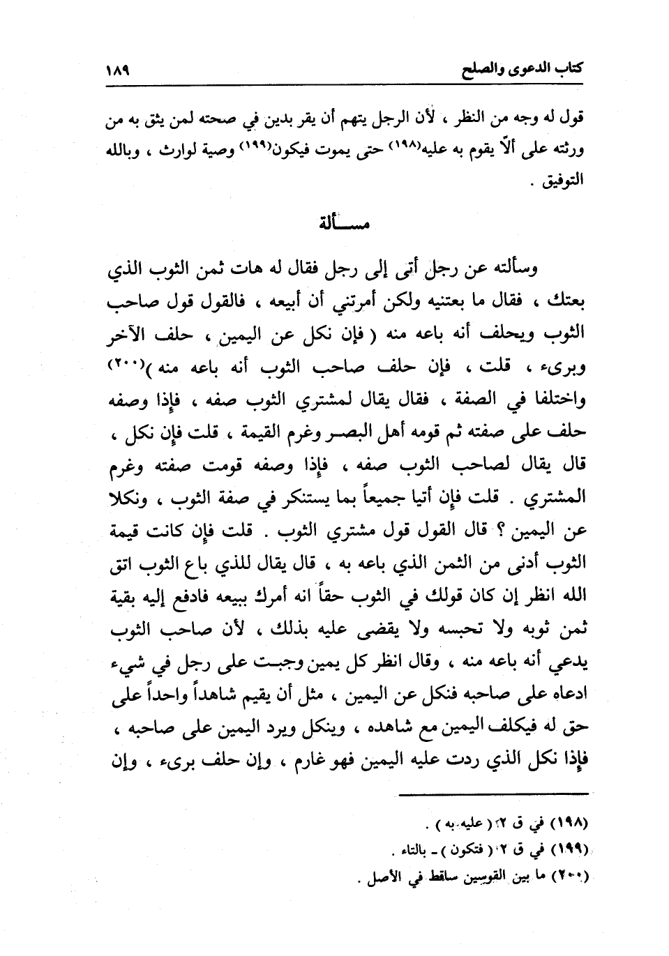 مسألة وسألته عن رجل أتى إلى رجل فقال له: هات ثمن الثوب الذي بعتك، فقال ما بعتنيه ولكن أمرتني أن أبيعه، فالقول قول صاحب الثوب ويحلف أنه باعه منه (فإن نكل عن اليمين، حلف الآخر وبرئ، قلت: فإن حلف صاحب الثوب أنه باعه منه) واختلفا في الصفة، فقال: يقال لمشتري الثوب: صفه، فإذا وصفه حلف على صفته ثم قومه أهل البصر وغرم القيمة، قلت: فإن نكل، قال: يقال لصاحب الثوب: صفه، فإذا وصفه قومت صفته وغرم المشتري. قلت فإن أتيا جميعا بما يستنكر في صفة الثوب، ونكلا عن اليمين؛ قال: القول قول مشتري الثوب. قلت فإن كانت قيمة الثوب أدنى من الثمن الذي باعه به، قال: يقال للذي باع الثوب اتق الله انظر إن كان قولك في الثوب حقا إنه أمرك ببيعه فادفع إليه بقية ثمن ثوبه ولا تحبسه ولا يقضى عليه بذلك؛ لأن صاحب الثوب يدعي أنه باعه منه، وقال: انظر كل يمين وجبت على رجل في شيء ادعاه على صاحبه فنكل عن اليمين، مثل أن يقيم شاهدا واحدا على حق له فيكلف اليمين مع شاهده، وينكل ويرد اليمين على صاحبه، فإذا نكل الذي ردت عليه اليمين فهو غارم، وإن حلف برئ، وإن