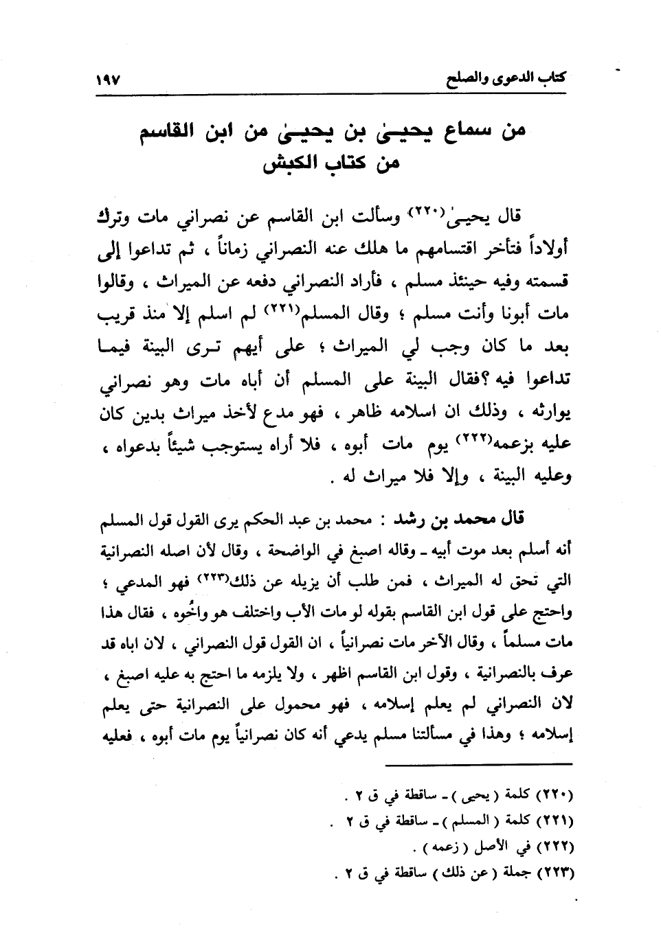 قال محمد بن رشد: محمد بن عبد الحكم يرى القول قول المسلم أنه أسلم بعد موت أبيه- وقاله أصبغ في الواضحة، وقال: لأن أصله النصرانية التي تحق له الميراث، فمن طلب أن يزيله عن ذلك فهو المدعي؛ واحتج على قول ابن القاسم بقوله: لو مات الأب واختلف هو وأخوه، فقال هذا مات مسلما، وقال الآخر مات نصرانيا، أن القول قول النصراني؛ لأن أباه قد عرف بالنصرانية، وقول ابن القاسم أظهر، ولا يلزمه ما احتج به عليه أصبغ؛ لأن النصراني لم يعلم إسلامه، فهو محمول على النصرانية حتى يعلم إسلامه؛ وهذا في مسألتنا مسلم يدعي أنه كان نصرانيا يوم مات أبوه، فعليه