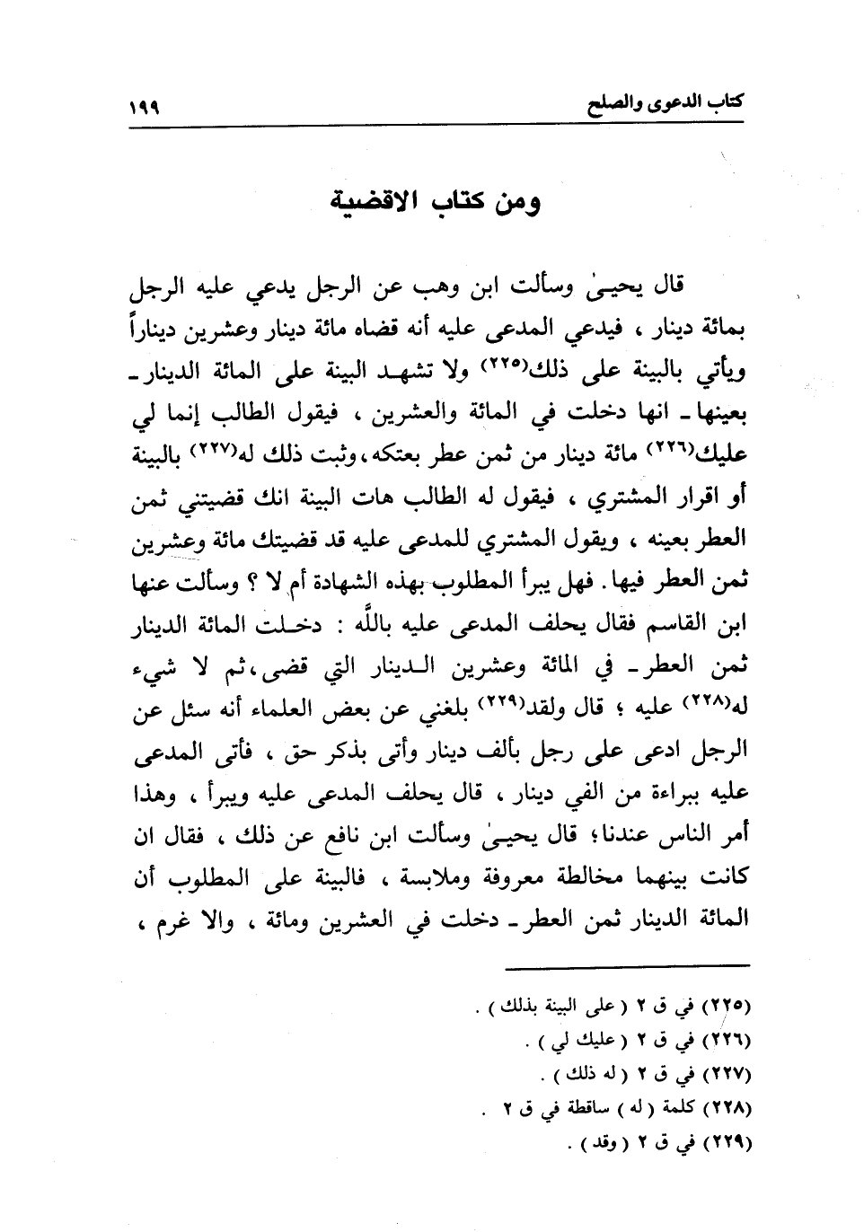 ومن كتاب الأقضية قال يحيى: وسألت ابن وهب عن الرجل يدعي عليه الرجل بمائة دينار، فيدعي المدعى عليه أنه قضاه مائة دينار وعشرين دينارا ويأتي بالبينة على ذلك ولا تشهد البينة على المائة الدينار- بعينها- إنها دخلت في المائة والعشرين، فيقول الطالب إنما لي عليك مائة دينار من ثمن عطر بعتكه، وثبت ذلك له بالبينة أو إقرار المشتري، فيقول له الطالب هات البينة أنك قضيتني ثمن العطر بعينه، ويقول المشتري للمدعى عليه قد قضيتك مائة وعشرين ثمن العطر فيها. فهل يبرأ المطلوب بهذه الشهادة أم لا؛ وسألت عنها ابن القاسم، فقال: يحلف المدعى عليه بالله: دخلت المائة الدينار ثمن العطر في المائة وعشرين الدينار التي قضى، ثم لا شيء له عليه؛ قال ولقد بلغني عن بعض العلماء أنه سئل عن الرجل ادعى على رجل بألف دينار وأتى بذكر حق، فأتى المدعى عليه ببراءة من ألفي دينار، قال يحلف المدعى عليه ويبرأ، وهذا أمر الناس عندنا؛ قال يحيى وسألت ابن نافع عن ذلك، فقال: إن كانت بينهما مخالطة معروفة وملابسة، فالبينة على المطلوب أن المائة الدينار ثمن العطر- دخلت في العشرين ومائة، وإلا غرم،