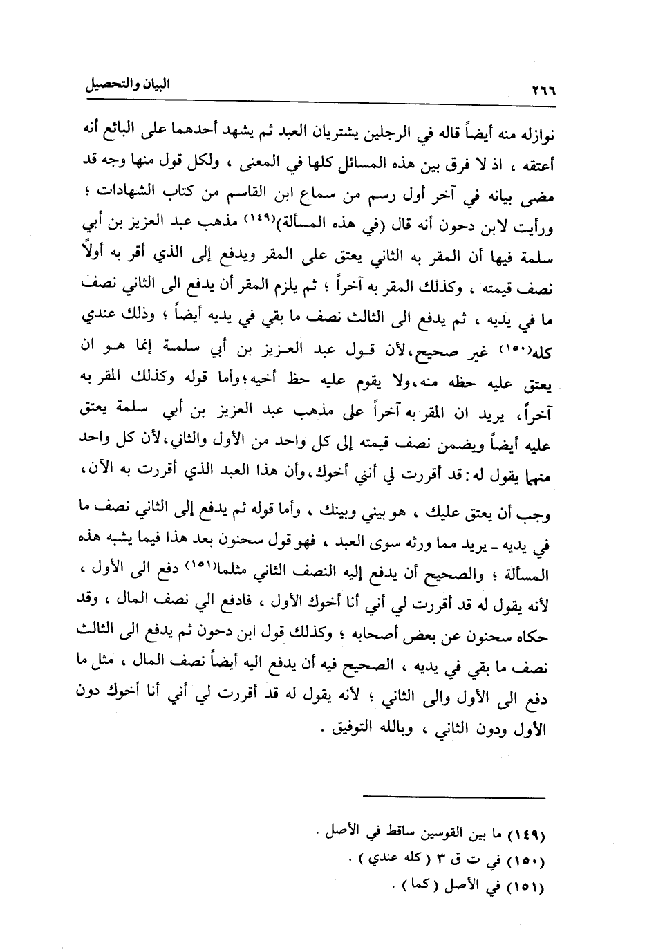 نوازله منه أيضا قاله في الرجلين يشتريان العبد ثم يشهد أحدهما على البائع أنه أعتقه، إذ لا فرق بين هذه المسائل، كلها في المعنى، ولكل قول منها وجه قد مضى بيانه في آخر أول رسم من سماع ابن القاسم من كتاب الشهادات؛ ورأيت لابن دحون أنه قال: (في هذه المسألة) مذهب عبد العزيز بن أبي سلمة فيها أن المقر به الثاني يعتق على المقر ويدفع إلى الذي أقر به أولا نصف قيمته، وكذلك المقر به آخرا؛ ثم يلزم المقر أن يدفع إلى الثاني نصف ما في يديه، ثم يدفع إلى الثالث نصف ما بقي في يديه أيضا؛ وذلك عندي كله غير صحيح، لأن قول عبد العزيز بن أبي سلمة إنما هو أن يعتق عليه حظه منه، ولا يقوم عليه حظ أخيه، وأما قوله وكذلك المقر به آخرا، يريد أن المقر به آخرا على مذهب عبد العزيز بن أبي سلمة يعتق عليه أيضا ويضمن نصف قيمته إلى كل واحد من الأول والثاني، لأن كل واحد منهما يقول له: قد أقررت لي أنني أخوك، وأن هذا العبد الذي أقررت به الآن، وجب أن يعتق عليك، هو بيني وبينك، وأما قوله ثم يدفع إلى الثاني نصف ما في يديه- يريد مما ورثه سوى العبد، فهو قول سحنون بعد هذا فيما يشبه هذه المسألة؛ والصحيح أن يدفع إليه النصف الثاني مثلما دفع إلى الأول، لأنه يقول له قد أقررت لي أني أنا أخوك الأول، فادفع إلي نصف المال، وقد حكاه سحنون عن بعض أصحابه؛ وكذلك قول ابن دحون ثم يدفع إلى الثالث نصف ما بقي في يديه، الصحيح فيه أن يدفع إليه أيضا نصف المال، مثل ما دفع إلى الأول وإلى الثاني؛ لأنه يقول له قد أقررت لي أني أنا أخوك دون الأول ودون الثاني، وبالله التوفيق.