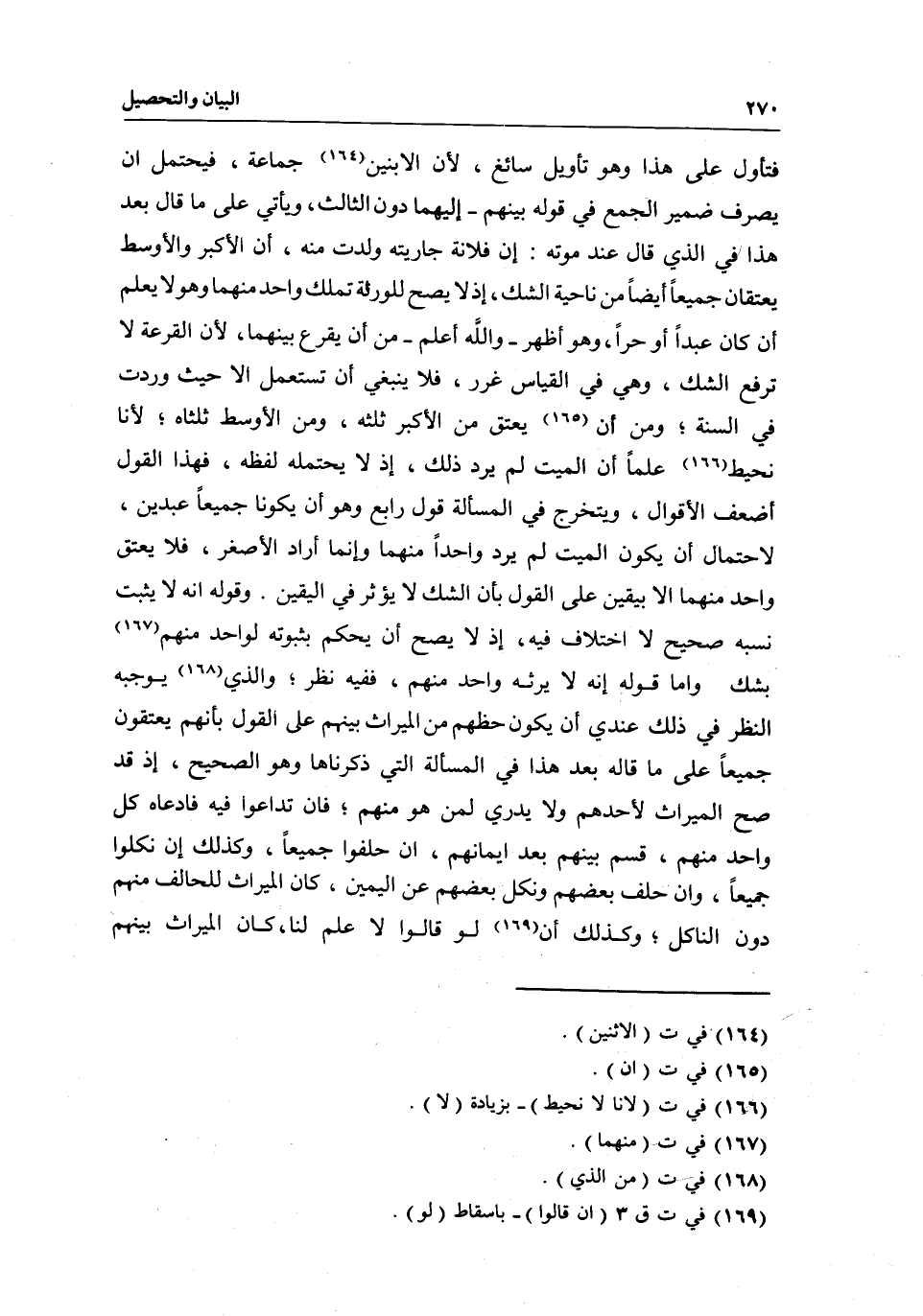 فتأول على هذا وهو تأويل سائغ، لأن الابنين جماعة، فيحتمل أن يصرف ضمير الجمع في قوله بينهم؛ إليهما دون الثالث، ويأتي على ما قال بعد هذا في الذي قال عند موته: إن فلانة جاريته ولدت منه، أن الأكبر والأوسط يعتقان جميعا أيضا من ناحية الشك، إذ لا يصح للورثة تملك واحد منهما وهو لا يعلم إن كان عبدا أو حرا، وهو أظهر - والله أعلم- من أن يقرع بينهما، لأن القرعة لا ترفع الشك، وهي في القياس غرر، فلا ينبغي أن تستعمل إلا حيث وردت في السنة، ومن أن يعتق من الأكبر ثلثه، ومن الأوسط ثلثاه، لأنا نحيط علما أن الميت لم يرد ذلك، إذ لا يحتمله لفظه، فهذا القول أضعف الأقوال، ويتخرج في المسألة قول رابع وهو أن يكونا جميعا عبدين، لاحتمال أن يكون الميت لم يرد واحدا منهما وإنما أراد الأصغر، فلا يعتق واحد منهما إلا بيقين على القول بأن الشك لا يؤثر في اليقين. وقوله: إنه لا يثبت نسبه صحيح لا اختلاف فيه، إذ لا يصح أن يحكم بثبوته لواحد منهم بشك، وأما قوله: إنه لا يرثه واحد منهم، ففيه نظر؛ والذي يوجبه النظر في ذلك عندي أن يكون حظهم من الميراث بينهم على القول بأنهم يعتقون جميعا على ما قاله بعد هذا في المسألة التي ذكرناها وهو الصحيح، إذ قد صح الميراث لأحدهم ولا يدري لمن هو منهم، فإن تداعوا فيه فادعاه كل واحد منهم، قسم بينهم بعد أيمانهم، إن حلفوا جميعا، وكذلك إن نكلوا جميعا، وإن حلف بعضهم ونكل بعضهم عن اليمين، كان الميراث للحالف منهم دون الناكل؛ وكذلك أن لو قالوا لا علم لنا، كان الميراث بينهم