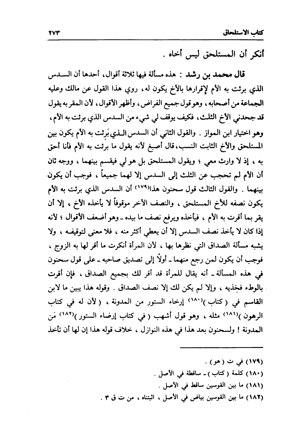 قال محمد بن رشد: هذه مسألة فيها ثلاثة أقوال، أحدها: أن السدس الذي برئت به الأم لإقرارها بالأخ يكون له، روي هذا القول عن مالك وعليه الجماعة من أصحابه، وهو قول جميع الفراض، وأظهر الأقوال؛ لأن المقر به يقول قد جحدني الأخ الثلث، فكيف يوقف لي شيء من السدس الذي برئت به الأم، وهو اختيار ابن المواز. والقول الثاني: أن السدس الذي برئت به الأم يكون بين المستلحق والأخ الثابت النسب، قال أصبغ: لأنه يقول ما برئت به الأم فأنا أحق به، إذ لا وارث معي؛ ويقول المستلحق: بل هو لي فيقسم بينهما، ووجه ثان: أن الأم لم تحجب عن الثلث إلى السدس إلا لهما جميعا، فوجب أن يكون بينهما. والقول الثالث: قول سحنون هذا أن السدس الذي برئت به الأم يكون نصفه للأخ المستلحق، والنصف الآخر موقوفا لا يأخذه الأخ، إلا أن يقر بما أقرت به الأم، فيأخذه ويرفع نصف ما بيده- وهو أضعف الأقوال، لأنه إذا كان لا يأخذ نصف السدس إلا أن يعطي أكثر منه، فلا معنى لتوقيفه، ولا يشبه مسألة الصداق التي نظرها بها، لأن المرأة أنكرت ما أقر لها به الزوج، فوجب أن يكون لمن رجع منهما- أولا إلى تصديق صاحبه- على قول سحنون في هذه المسألة- أنه يقال للمرأة قد أقر لك بجميع الصداق، فإن أقرت بالوطء فخذيه، وإلا لم يكن لك إلا نصف الصداق. وقوله هذا يبين ما لابن القاسم في (كتاب) إرخاء الستور من المدونة، (لأن له في كتاب الرهون) مثله، وهو قول أشهب (في كتاب إرضاء الستور) من المدونة، ولسحنون بعد هذا في هذه النوازل، خلاف قوله هذا إن لها أن تأخذ