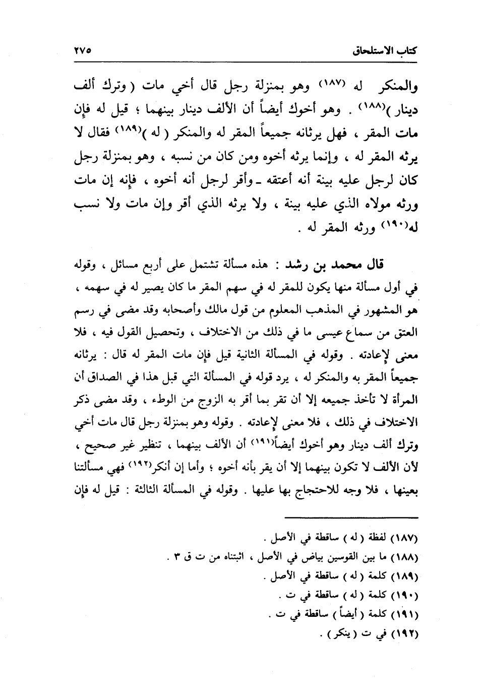 قال محمد بن رشد: هذه مسألة تشتمل على أربع مسائل، وقوله في أول مسألة منها يكون للمقر له في سهم المقر ما كان يصير له في سهمه، هو المشهور في المذهب المعلوم من قول مالك وأصحابه وقد مضى في رسم العتق من سماع عيسى ما في ذلك من الاختلاف، وتحصيل القول فيه، فلا معنى لإعادته. وقوله في المسألة الثانية قيل: فإن مات المقر له قال: يرثانه جميعا المقر به والمنكر له، يرد قوله في المسألة التي قبل هذا في الصداق أن المرأة لا تأخذ جميعه إلا أن تقر بما أقر به الزوج من الوطء، وقد مضى ذكر الاختلاف في ذلك، فلا معنى لإعادته. وقوله: وهو بمنزلة رجل قال: مات أخي وترك ألف دينار وهو أخوك أيضا أن الألف بينهما، تنظير غير صحيح، لأن الألف لا تكون بينهما إلا أن يقر بأنه أخوه؛ وأما إن أنكر فهي مسألتنا بعينها، فلا وجه للاحتجاج بها عليها. وقوله في المسألة الثالثة. قيل له فإن