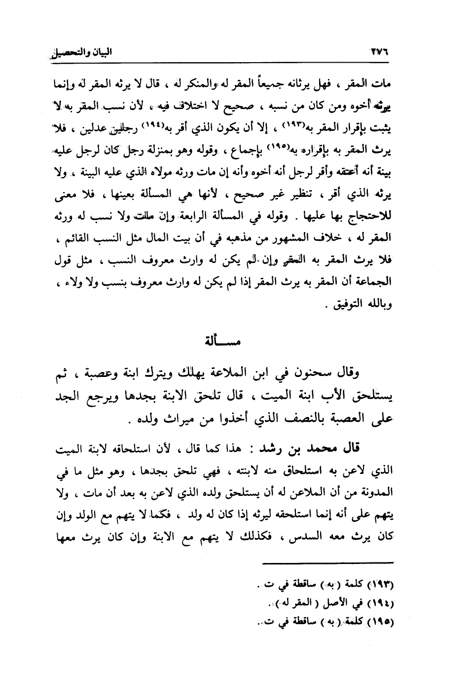 مات المقر، فهل يرثانه جميعا المقر له والمنكر له، قال: لا يرثه المقر له وإنما يرثه أخوه ومن كان من نسبه، صحيح لا اختلاف فيه، لأن نسب المقر به لا يثبت بإقرار المقر به، إلا أن يكون الذي أقر به رجلين عدلين، فلا يرث المقر به بإقراره به بإجماع، وقوله: وهو بمنزلة رجل كان لرجل عليه بينة أنه أعتقه وأقر لرجل أنه أخوه وأنه إن مات ورثه مولاه الذي عيه البينة، ولا يرثه الذي أقر، تنظير غير صحيح، لأنها هي المسألة بعينها، فلا معنى للاحتجاج بها عليها. وقوله في المسألة الرابعة: وإن مات ولا نسب له ورثه المقر له، خلاف المشهور من مذهبه في أن بيت المال مثل النسب القائم، فلا يرث المقر به المقر وإن لم يكن له وارث معروف النسب، مثل قول الجماعة أن المقر به يرث المقر إذا لم يكن له وارث معروف بنسب ولا ولاء، وبالله التوفيق.
