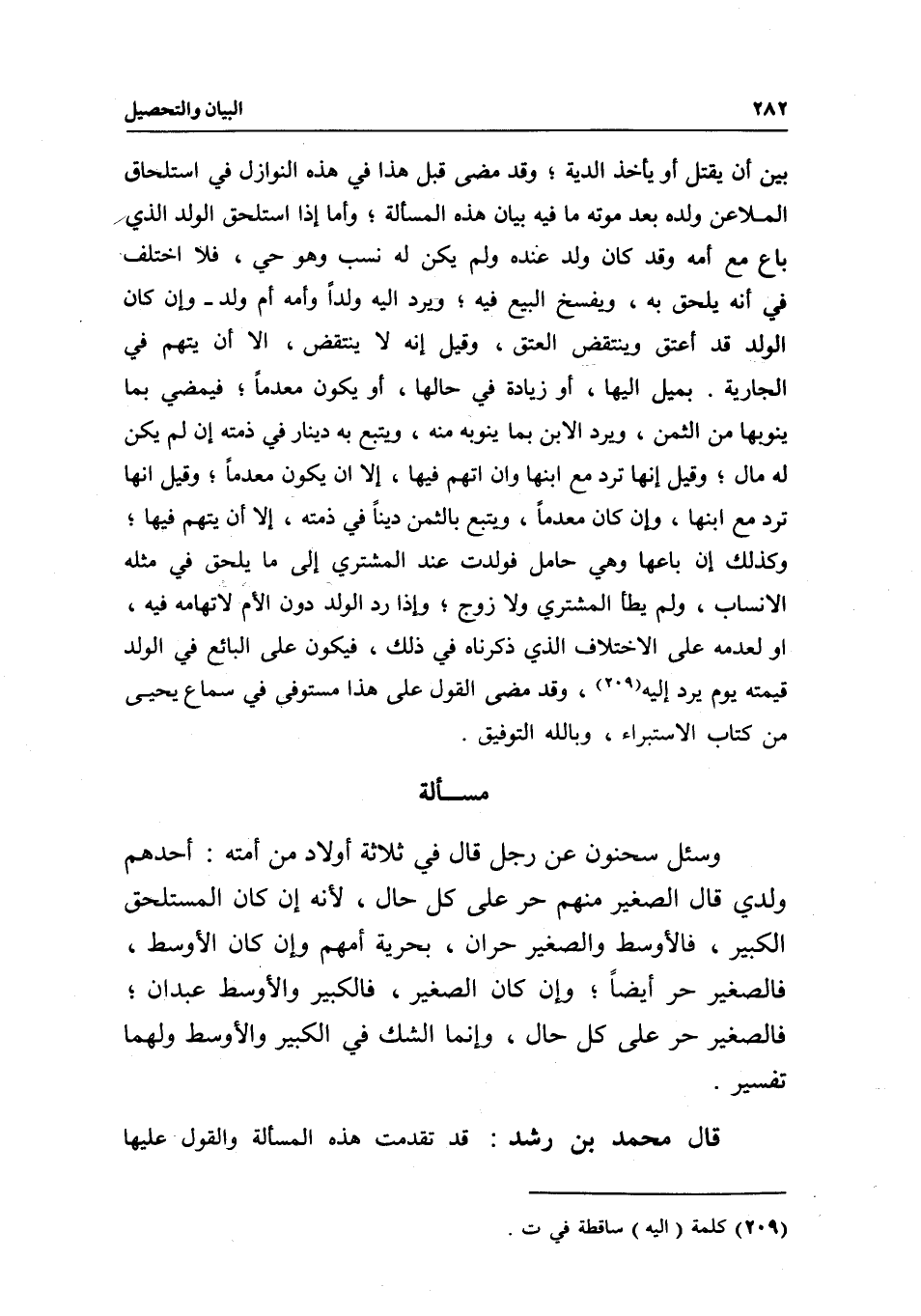 بين أن يقتل أو يأخذ الدية؛ وقد مضى قبل هذا في هذه النوازل في استلحاق الملاعن ولده بعد موته ما فيه بيان هذه المسألة؛ وأما إذا استلحق الولد الذي باع مع أمه وقد كان ولد عنده ولم يكن له نسب وهو حي، فلا اختلاف في أنه يلحق به، ويفسخ البيع فيه؛ ويرد إليه ولدا وأمه أم ولد - وإن كان الولد قد أعتق وينتقض العتق، وقيل إنه لا ينتقض، إلا أن يتهم في الجارية بميل إليها، أو زيادة في حالها، أو يكون معدما؛ فيمضي بما ينوبها من الثمن، ويرد الابن بما ينوبه منه، ويتبع به دينار في ذمته إن لم يكن له مال، وقيل: إنها ترد مع ابنها وإن اتهم فيها، إلا أن يكون معدما؛ وقيل: إنها ترد مع ابنها، وإن كان معدما، ويتبع بالثمن دينا في ذمته، إلا أن يتهم فيها، وكذلك إن باعها وهي حامل فولدت عند المشتري إلى ما يلحق في مثله الأنساب، ولم يطأ المشتري ولا زوج؛ وإذا رد الولد دون الأم لاتهامه فيه، أو لعدمه على الاختلاف الذي ذكرناه في ذلك، فيكون على البائع في الولد قيمته يوم يرد إليه، وقد مضى القول على هذا مستوفى في سماع يحيى من كتاب الاستبراء، وبالله التوفيق.