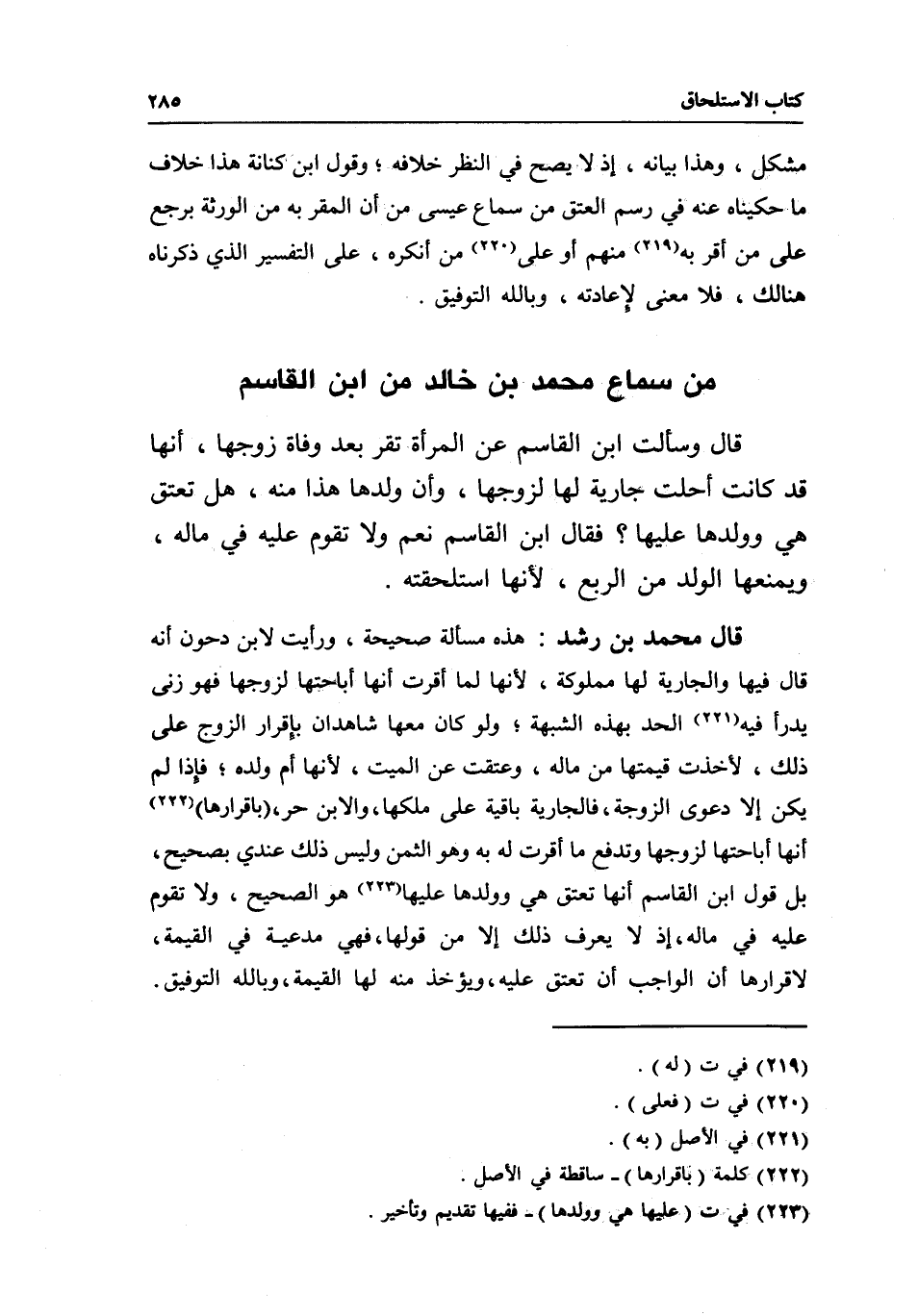 قال: وسألت ابن القاسم عن المرأة تقر بعد وفاة زوجها، أنها قد كانت أحلت جارية لها لزوجها، وأن ولدها هذا منه، هل تعتق هي وولدها عليها؟ فقال ابن القاسم: نعم، ولا تقوم عليه في ماله، ويمنعها الولد من الربع، لأنها استلحقته.