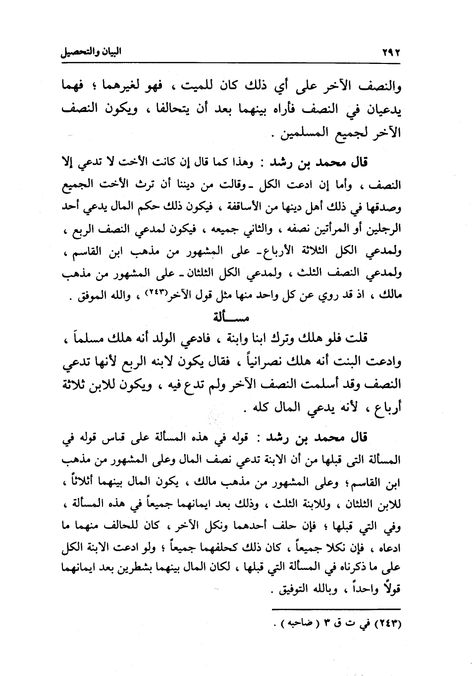 قال محمد بن رشد: وهذا كما قال: إن كانت الأخت لا تدعي إلا النصف، وأما إن ادعت الكل- وقالت من ديننا أن ترث الأخت الجميع وصدقها في ذلك أهل دينها من الأساقفة، فيكون ذلك حكم المال يدعي أحد الرجلين أو المرأتين نصفه، والثاني جميعه، فيكون لمدعي النصف الربع، ولمدعي الكل الثلاثة الأرباع- على المشهور من مذهب ابن القاسم، ولمدعي النصف الثلث، ولمدعي الكل الثلثان- على المشهور من مذهب مالك، إذ قد روي عن كل واحد منها مثل قول الآخر، والله الموفق.
