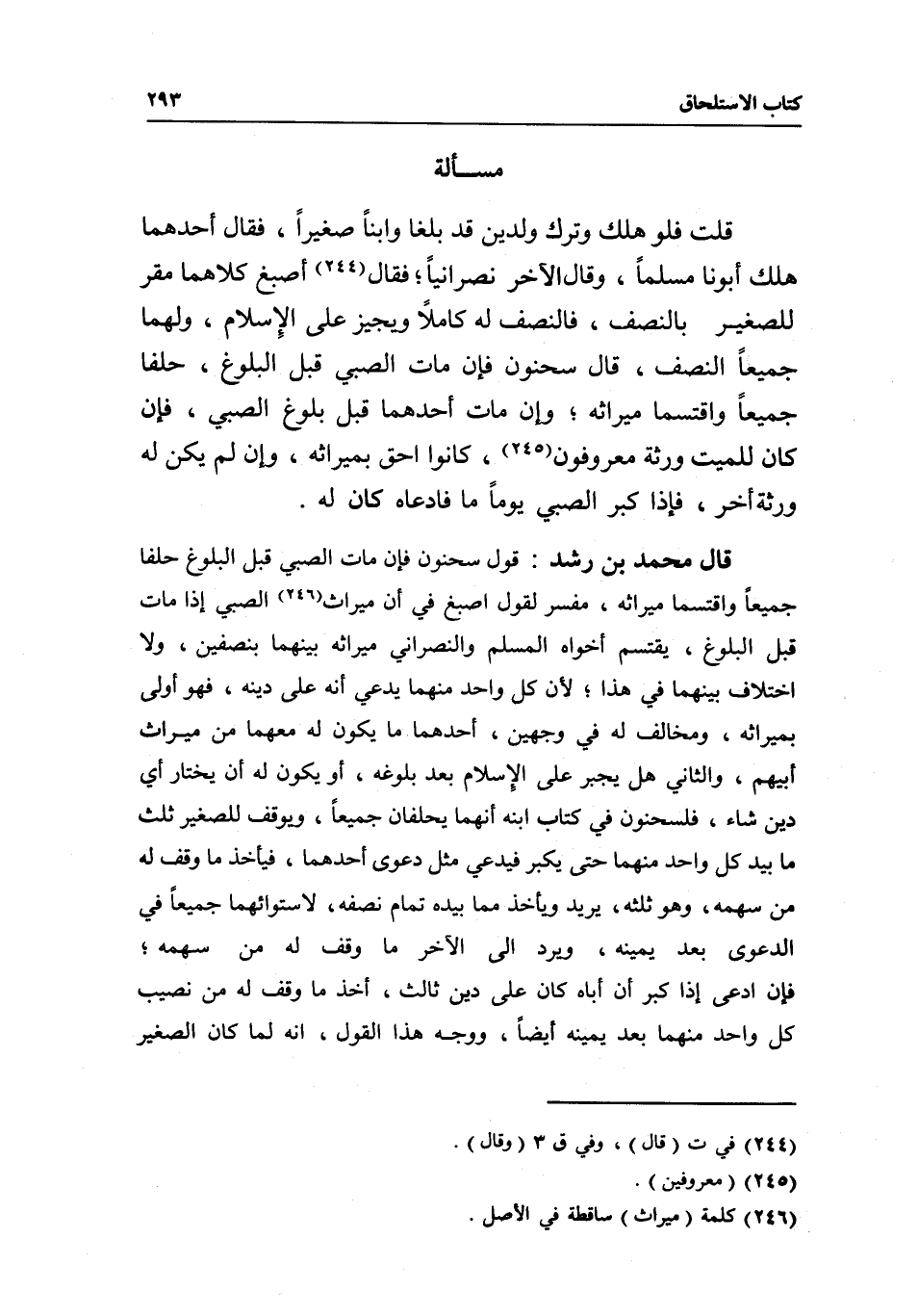 قال محمد بن رشد: قول سحنون: فإن مات الصبي قبل البلوغ حلفا جميعا واقتسما ميراثه، مفسر لقول أصبغ في أن ميراث الصبي إذا مات قبل البلوغ، يقتسم أخواه المسلم والنصراني ميراثه بينهما بنصفين، ولا اختلاف بينهما في هذا؛ لأن كل واحد منهما يدعي أنه على دينه، فهو أولى بميراثه، ومخالف له في وجهين، أحدهما ما يكون له معهما من ميراث أبيهم، والثاني هل يجبر على الإسلام بعد بلوغه، أو يكون له أن يختار أي دين شاء، فلسحنون في كتاب ابنه أنهما يحلفان جميعا، ويوقف للصغير ثلث ما بيد كل واحد منهما حتى يكبر فيدعي مثل دعوى أحدهما، فيأخذ ما وقف له من سهمه، وهو ثلثه، يريد ويأخذ مما بيده تمام نصفه، لاستوائهما جميعا في الدعوى بعد يمينه، ويرد إلى الآخر ما وقف له من سهمه؛ فإن ادعى إذا كبر أن أباه كان على دين ثالث، أخذ ما وقف له من نصيب كل واحد منهما بعد يمينه أيضا، ووجه هذا القول، أنه لما كان الصغير