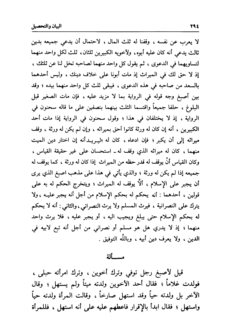 لا يعرب عن نفسه، وقفنا له ثلث المال، لاحتمال أن يدعي جميعه بدين ثالث يدعي أنه كان عليه أبوه، ولأخويه الكبيرين ثلثان، ثلث لكل واحد منهما لتساويهما في الدعوى، ثم يقول كل واحد منهما لصاحبه: تخل لنا عن ثلثك، إذ لا حق لك في الميراث إذ مات أبونا على خلاف دينك، وليس أحدهما بالسعد من صاحبه في هذه الدعوى، فيبقى ثلث كل واحد منهما بيده؛ وقد بين أصبغ وجه قوله في الرواية بما لا مزيد عليه، فإن مات الصغير قبل البلوغ، حلفا جميعا واقتسما الثلث بينهما بنصفين على ما قاله سحنون في الرواية، إذ لا يختلفان في هذا، وقول سحنون في الرواية إذا مات أحد الكبيرين، أنه إن كان له ورثة كانوا أحق بميراثه، وإن لم يكن له ورثة، وقف ميراثه إلى أن يكبر؛ فإن ادعاه، كان له؛ ليريد أنه إن اختار دين الميت منهما، كان له ميراثه الذي وقف له- استحسان على غير حقيقة القياس، وكان القياس أن يوقف له قدر حظه من الميراث إذا كان له ورثة، كما يوقف له جميعه إذا لم يكن له ورثة، والذي يأتي في هذا على مذهب أصبغ الذي يرى أن يجبر على الإسلام، ألا يوقف له الميراث؛ ويتخرج الحكم له به على قولين، أحدهما: أنه يحكم له بحكم الإسلام من أجل أنه يجبر عليه، ولا يترك على النصرانية، فيرث المسلم ولا يرث النصراني، والثاني: أنه لا يحكم له بحكم الإسلام حتى يبلغ ويجيب إليه، أو يجبر عليه، فلا يرث واحد منهما، إذ لا يدري هل هو مسلم أو نصراني من أجل أنه تبع لأبيه في الدين، ولا يعرف دين أبيه، وبالله التوفيق.