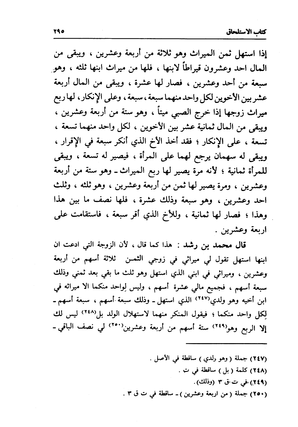 قال محمد بن رشد: هذا كما قال، لأن الزوجة التي ادعت أن ابنها استهل تقول: لي ميراثي في زوجي الثمن ثلاثة أسهم من أربعة وعشرين، وميراثي في ابني الذي استهل وهو ثلث ما بقي بعد ثمني وذلك سبعة أسهم، فجميع مالي عشرة أسهم، وليس لواحد منكما إلا ميراثه في ابن أخيه وهو ولدي الذي استهل- وذلك سبعة أسهم، سبعة أسهم- لكل واحد منكما، فيقول المنكر منهما لاستهلال الولد بل ليس لك إلا الربع وهو ستة أسهم من أربعة وعشرين لي نصف الباقي-
