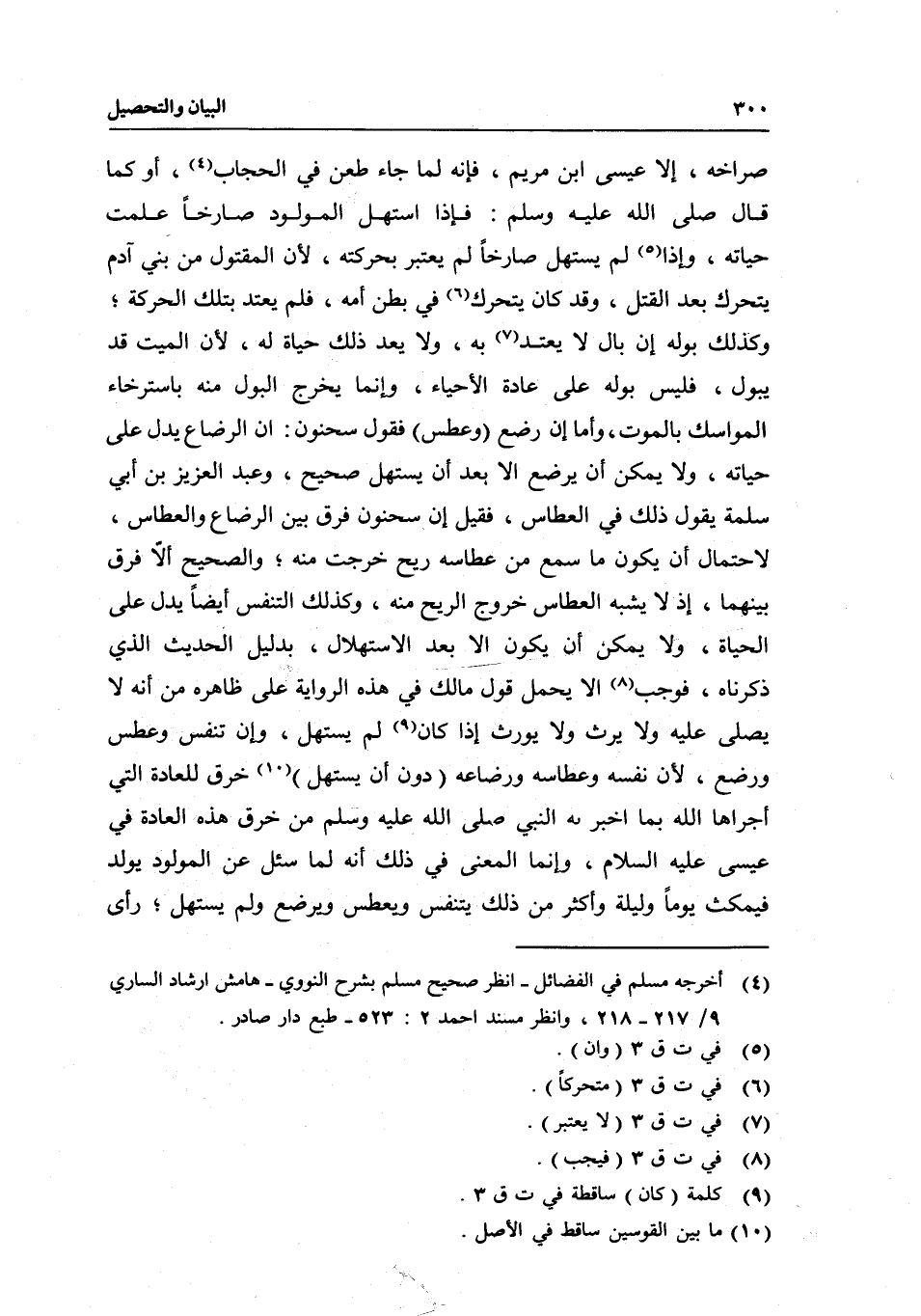 صراخه، إلا عيسى ابن مريم، فإنه لما جاء طعن في الحجاب» أو كما قال - صَلَّى اللَّهُ عَلَيْهِ وَسَلَّمَ -: (فإذا استهل المولود صارخا علمت حياته) ، وإذا لم يستهل صارخا لم يعتبر بحركته، لأن المقتول من بني آدم يتحرك بعد القتل، وقد كان يتحرك في بطن أمه، فلم يعتد بتلك الحركة؛ وكذلك بوله إن بال لا يعتد به، ولا يعد ذلك حياة له، لأن الميت قد يبول، فليس بوله على عادة الأحياء، وإنما يخرج البول منه باسترخاء المواسك بالموت، وأما إن رضع وعطس) فقول سحنون: إن الرضاع يدل على حياته، ولا يمكن أن يرضع إلا بعد أن يستهل صحيح، وعبد العزيز بن أبي سلمة يقول ذلك في العطاس، فقيل: إن سحنون فرق بين الرضاع والعطاس، لاحتمال أن يكون ما سمع من عطاسه ريح خرجت منه؛ والصحيح ألا فرق بينهما، إذ لا يشبه العطاس خروج الريح منه، وكذلك التنفس أيضا يدل على الحياة، ولا يمكن أن يكون إلا بعد الاستهلال، بدليل الحديث الذي ذكرناه، فوجب ألا يحمل قول مالك في هذه الرواية على ظاهره من أنه لا يصلى عليه ولا يرث ولا يورث إذا كان لم يستهل، وإن تنفس وعطس ورضع، لأن نفسه وعطاسه ورضاعه (دون أن يستهل) خرق للعادة التي أجراها الله بما أخبر به النبي - صَلَّى اللَّهُ عَلَيْهِ وَسَلَّمَ - من خرق هذه العادة في عيسى - عَلَيْهِ السَّلَامُ -، وإنما المعنى في ذلك أنه لما سئل عن المولود يولد فيمكث يوما وليلة وأكثر من ذلك يتنفس ويعطس ويرضع ولم يستهل؛ رأى