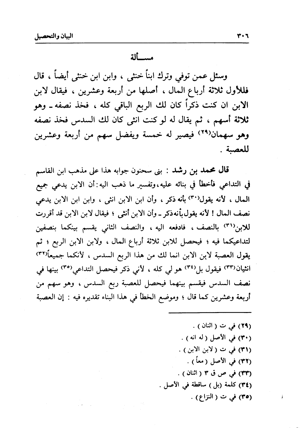 قال محمد بن رشد: بنى سحنون جوابه هذا على مذهب ابن القاسم في التداعي فأخطأ في بنائه عليه، وتفسير ما ذهب إليه: أن الابن يدعي جميع المال، لأنه يقول بأنه ذكر، وأن ابن الابن أنثى، وابن ابن الابن يدعي نصف المال لأنه يقول بأنه ذكر- وأن الابن أنثى؛ فيقال لابن الابن قد أقررت للابن بالنصف، فادفعه إليه، والنصف الثاني يقسم بينكما بنصفين لتداعيكما فيه؛ فيحصل للابن ثلاثة أرباع المال، ولابن الابن الربع؛ ثم يقول العصبة لابن الابن إنما لك من هذا الربع السدس، لأنكما جميعا أنثيان فيقول: بل هو لي كله، لأني ذكر فيحصل التداعي بينها في نصف السدس فيقسم بينهما فيحصل للعصبة ربع السدس، وهو سهم من أربعة وعشرين كما قال؛ وموضع الخطأ في هذا البناء تقديره فيه: أن العصبة