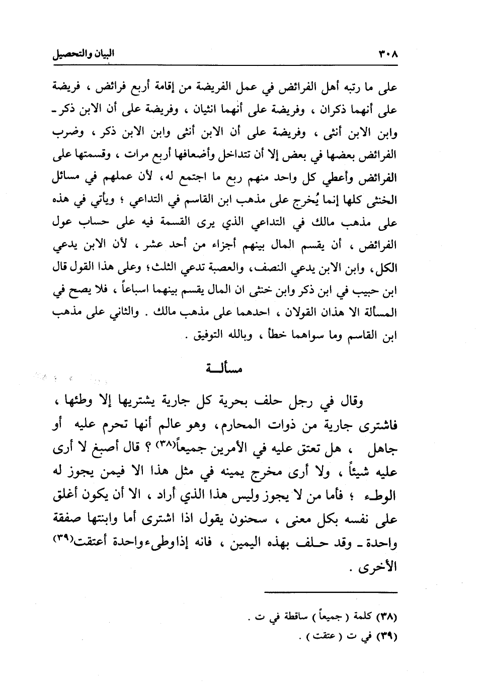 مسألة وقال: في رجل حلف بحرية كل جارية يشتريها إلا وطئها، فاشترى جارية من ذوات المحارم، وهو عالم أنها تحرم عليه أو جاهل، هل تعتق عليه في الأمرين جميعا؟ قال أصبغ: لا أرى عليه شيئا، ولا أرى مخرج يمينه في مثل هذا إلا فيمن يجوز له الوطء، فأما من لا يجوز وليس هذا الذي أراد، إلا أن يكون أغلق على نفسه بكل معنى، سحنون يقول إذا اشترى أما وابنتها صفقة واحدة- وقد حلف بهذه اليمين، فإنه إذا وطئ واحدة أعتقت الأخرى.