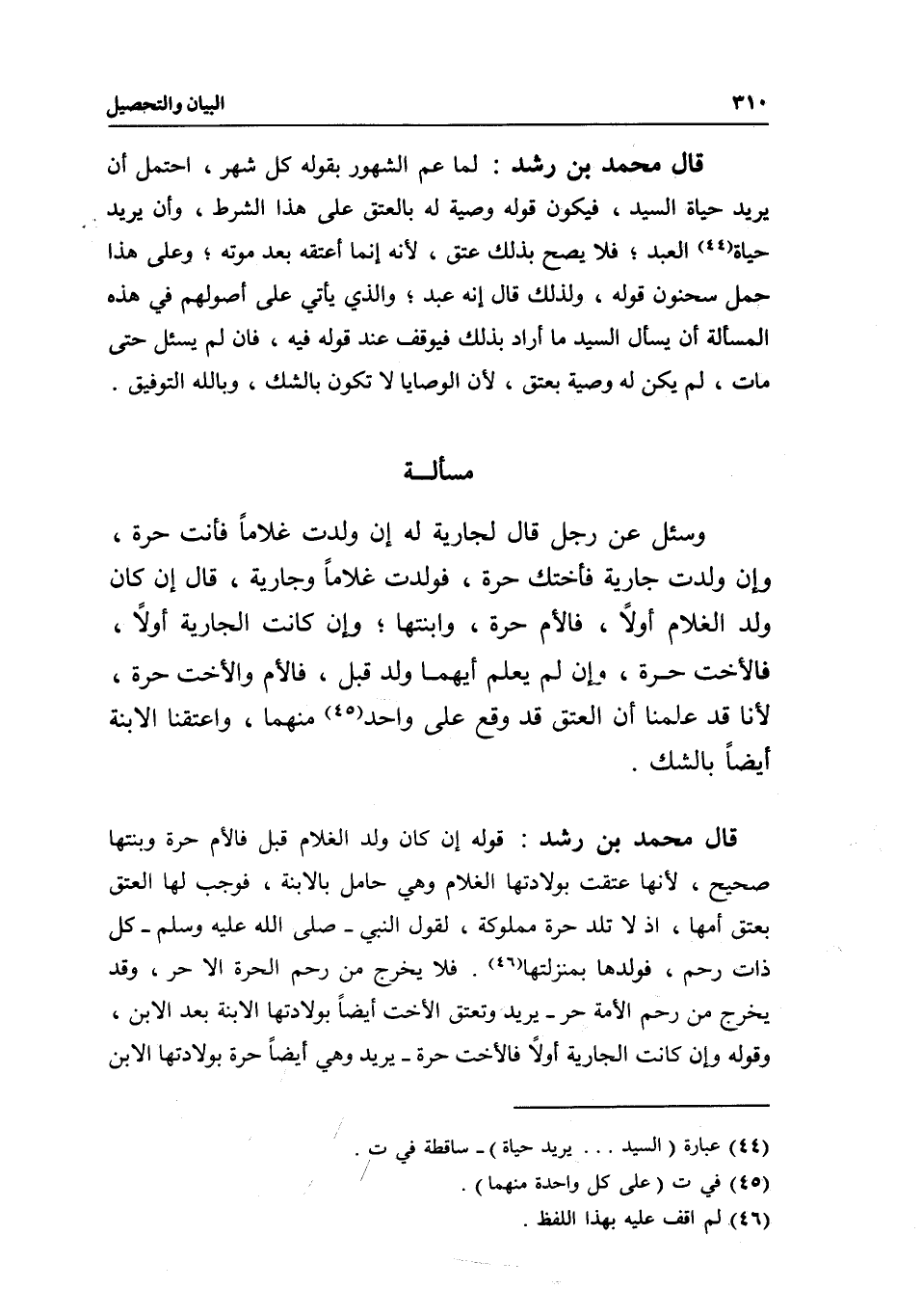 قال محمد بن رشد: قوله إن كان ولد الغلام قبل فالأم حرة وبنتها صحيح، لأنها عتقت بولادتها الغلام وهي حامل بالابنة، فوجب لها العتق بعتق أمها، إذ لا تلد حرة مملوكة، لقول النبي- صَلَّى اللَّهُ عَلَيْهِ وَسَلَّمَ -: «كل ذات رحم، فولدها بمنزلتها» . فلا يخرج من رحم الحرة إلا حر، وقد يخرج من رحم الأمة حر- يريد وتعتق الأخت أيضا بولادتها الابنة بعد الابن، وقوله: وإن كانت الجارية أولا فالأخت حرة- يريد وهي أيضا حرة بولادتها الابن
