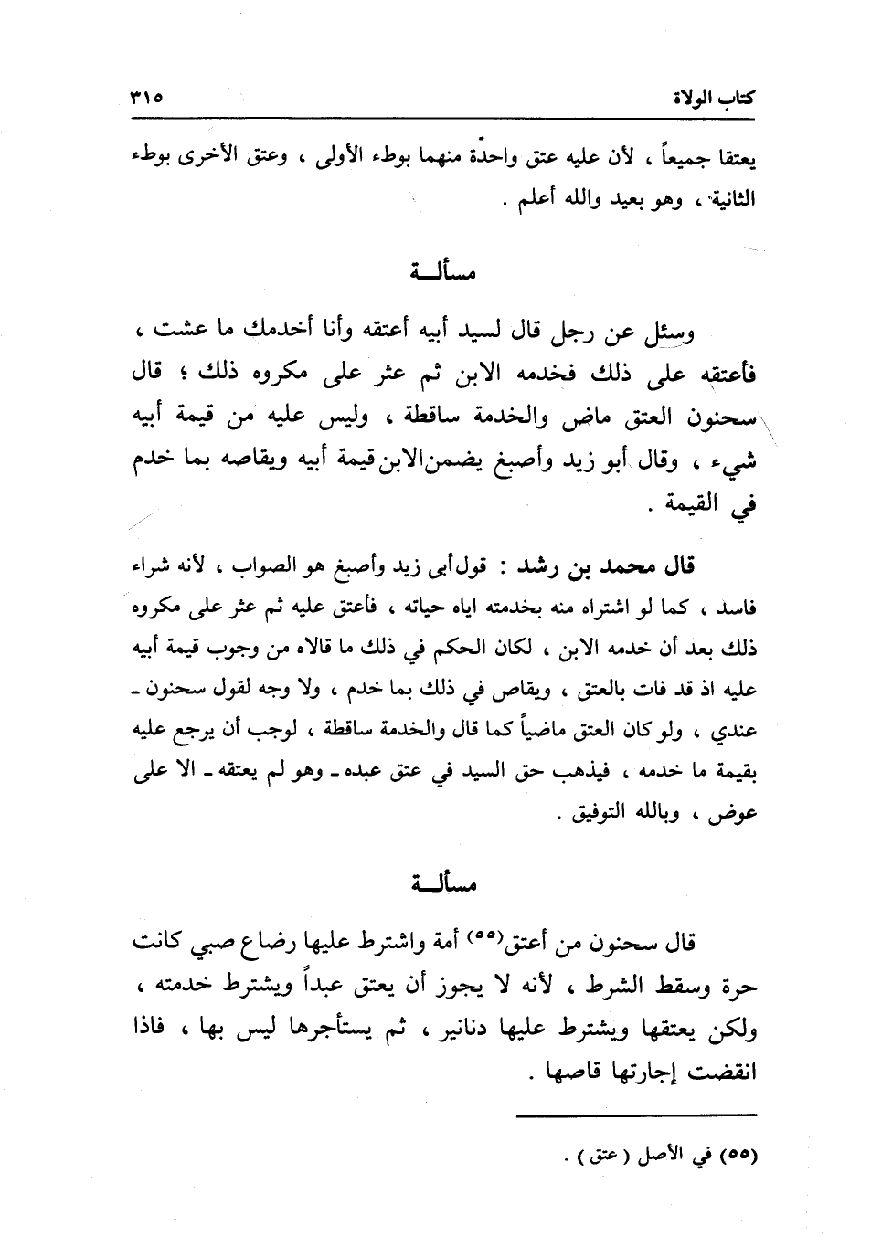 مسألة وسئل عن رجل قال لسيد أبيه: أعتقه وأنا أخدمك ما عشت، فأعتقه على ذلك فخدمه الابن ثم عثر على مكروه ذلك؛ قال سحنون: العتق ماض والخدمة ساقطة، وليس عليه من قيمة أبيه شيء، وقال أبو زيد وأصبغ: يضمن الابن قيمة أبيه ويقاصه بما خدم في القيمة.