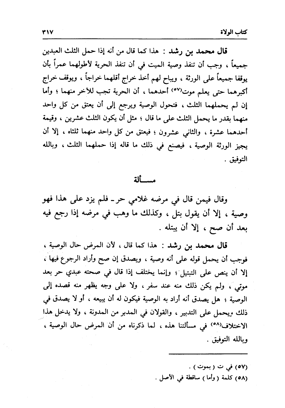 مسألة وقال فيمن قال في مرضه: غلامي حر- فلم يزد على هذا فهو وصية، إلا أن يقول بتل، وكذلك ما وهب في مرضه إذا رجع فيه بعد أن صح، إلا أن يبتله.