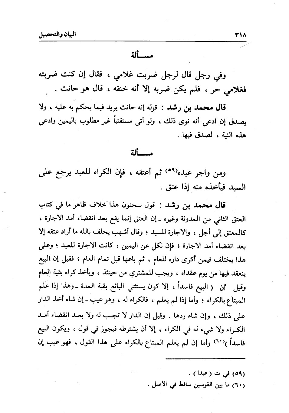 قال محمد بن رشد: قول سحنون هذا خلاف ظاهر ما في كتاب العتق الثاني من المدونة وغيره- إن العتق إنما يقع بعد انقضاء أمد الإجارة، كالمعتق إلى أجل، والإجارة للسيد؛ وقال أشهب: يحلف بالله ما أراد عتقه إلا بعد انقضاء أمد الإجارة، فإن نكل عن اليمين، كانت الإجارة للعبد؛ وعلى هذا يختلف فيمن أكرى داره للعام، ثم باعها قبل تمام العام؛ فقيل: إن البيع ينعقد فيها من يوم عقداه، ويجب للمشتري من حينئذ، ويأخذ كراء بقية العام وقيل: إن (البيع فاسد، إلا كون يستثني البائع بقية المدة- وهذا إذا علم المبتاع بالكراء؛ وأما إذا لم يعلم، فالكراء له، وهو عيب- إن شاء أخذ الدار على ذلك، وإن شاء ردها. وقيل: إن الدار لا تجب له ولا بعد انقضاء أمد الكراء ولا شيء له في الكراء، إلا أن يشترطه فيجوز في قول، ويكون البيع فاسدا) وأما إن لم يعلم المبتاع بالكراء على هذا القول، فهو عيب إن