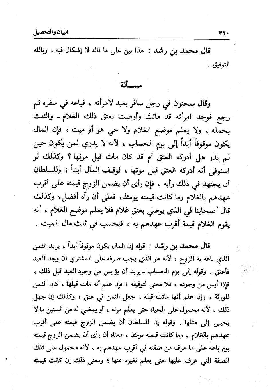 قال محمد بن رشد: قوله: إن المال يكون موقوفا أبدا، يريد الثمن الذي باعه به الزوج، لأنه هو الذي يجب صرفه على المشتري إن وجد العبد فأعتق. وقوله: إلى يوم الحساب- يريد أن يؤيس من وجود العبد قبل ذلك، فإذا أيس من وجوده، فلا معنى لتوقيفه؛ فإن علم أنه مات قبلها، كان الثمن للورثة، وإن علم أنها ماتت قبله، جعل الثمن في عتق؛ وكذلك أن جهل ذلك، لأنه محمول على الحياة حتى يعلم موته، أو يمضي له من السنين ما لا يحيا إلى مثلها. وقوله: إن للسلطان أن يضمن الزوج قيمته على أقرب عهدهم بالغلام، وما كانت قيمته يومئذ، معناه أن رأى أن يضمن الزوج قيمته يوم باعه على ما عرف من صفته في أقرب عهدهم به، لأنه محمول على تلك الصفة التي عرف عليها حتى يعلم تغيره عنها؛ ومعنى ذلك إن كانت قيمته