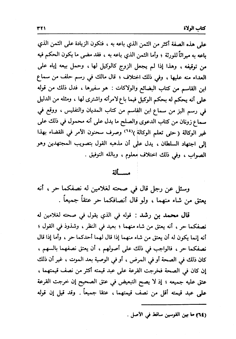 على هذه الصفة أكثر من الثمن الذي باعه له، فتكون الزيادة على الثمن الذي باعه به ميراثا للورثة؛ وأما الثمن الذي باعه به، فقد مضى ما يكون الحكم فيه من توقيفه، وهذا إذا لم يجعل الزوج كالوكيل لها، وحمل بيعه إياه على العداء منه عليها، وفي ذلك اختلاف؛ قال مالك في رسم حلف من سماع ابن القاسم من كتاب البضائع والوكالات: هو سفيرها، فدل ذلك من قوله على أنه يحكم له بحكم الوكيل فيما باع لامرأته واشترى لها، ومثله من الدليل في رسم البز من سماع ابن القاسم من كتاب المديان والتفليس، ووقع في سماع زونان من كتاب الدعوى والصلح ما يدل على أنه محمول في ذلك على غير الوكالة (حتى تعلم الوكالة) وصرف سحنون الأمر في القضاء بهذا إلى اجتهاد السلطان، يدل على أن مذهبه القول بتصويب المجتهدين وهو الصواب، وفي ذلك اختلاف معلوم، وبالله التوفيق.