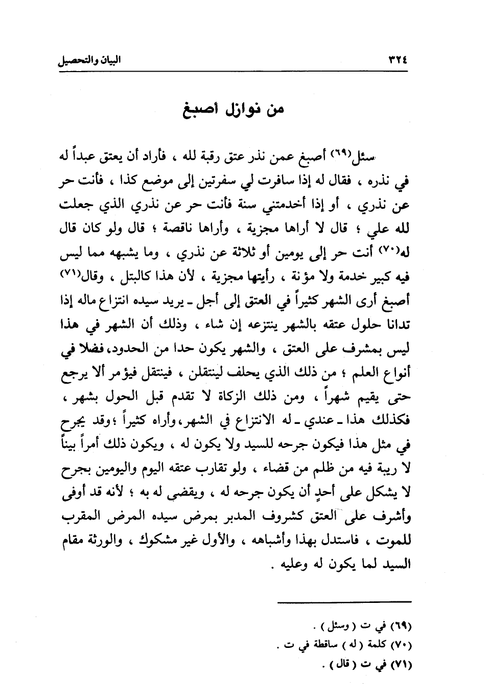 من نوازل أصبغ سئل أصبغ عمن نذر عتق رقبة لله، فأراد أن يعتق عبدا له في نذره، فقال له: إذا سافرت لي سفرتين إلى موضع كذا، فأنت حر عن نذري، أو إذا أخدمتني سنة فأنت حر عن نذري الذي جعلت لله علي؛ قال: لا أراها مجزية، وأراها ناقصة؛ قال: ولو كان قال له: أنت حر إلى يومين أو ثلاثة عن نذري، وما يشبهه مما ليس فيه كبير خدمة ولا مؤنة، رأيتها مجزية، لأن هذا كالبتل، وقال أصبغ: أرى الشهر كثيرا في العتق إلى أجل - يريد سيده انتزاع ماله إذا تدانا حلول عتقه بالشهر ينتزعه إن شاء، وذلك أن الشهر في هذا ليس بمشرف على العتق، والشهر يكون حدا من الحدود، فضلا في أنواع العلم؛ من ذلك الذي يحلف لينتقلن، فينتقل فيؤمر ألا يرجع حتى يقيم شهرا، ومن ذلك الزكاة لا تقدم قبل الحول بشهر، فكذلك هذا- عندي- له الانتزاع في الشهر، وأراه كثيرا؛ وقد يجرح في مثل هذا فيكون جرحه للسيد ولا يكون له، ويكون ذلك أمرا بينا لا ريبة فيه من ظلم من قضاء، ولو تقارب عتقه اليوم واليومين بجرح لا يشكل على أحد أن يكون جرحه له، ويقضى له به؛ لأنه قد أوفى وأشرف على العتق كشروف المدبر بمرض سيده المرض المقرب للموت، فاستدل بهذا وأشباهه، والأول غير مشكوك، والورثة مقام السيد لما يكون له وعليه.