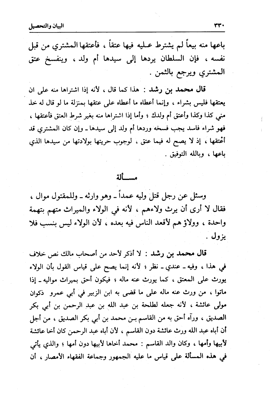 قال محمد بن رشد: لا أذكر لأحد من أصحاب مالك نص خلاف في هذا، وفيه- عندي- نظر؛ لأنه إنما يصح على قياس القول بأن الولاء يورث على المعتق، كما يورث عنه ماله؛ فيكون أحق بميراث مواليه- إذا ماتوا، من ورث عنه ماله على ما قضى به ابن الزبير في أبي عمرو ذكوان مولى عائشة، لأنه جعله لطلحة بن عبد الله بن عبد الرحمن بن أبي بكر الصديق، ورآه أحق به من القاسم بن محمد بن أبي بكر الصديق، من أجل أن أباه عبد الله ورث عائشة دون القاسم، لأن أباه عبد الرحمن كان أخا عائشة لأبيها وأمها، وكان والد القاسم: محمد أخاها لأبيها دون أمها؛ والذي يأتي في هذه المسألة على قياس ما عليه الجمهور وجماعة الفقهاء الأمصار، أن