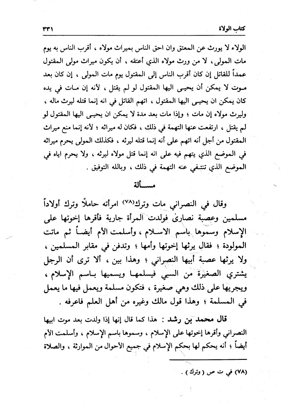 قال محمد بن رشد: هذا كما قال: إنها إذا ولدت بعد موت أبيها النصراني وأقرها إخوتها على الإسلام، وسموها باسم الإسلام، وأسلمت الأم أيضا؛ أنه يحكم لها بحكم الإسلام في جميع الأحوال من الموارثة، والصلاة