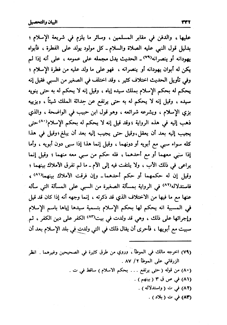 عليها، والدفن في مقابر المسلمين، وسائر ما يلزم في شريعة الإسلام؛ بدليل قول النبي - عَلَيْهِ الصَّلَاةُ وَالسَّلَامُ - «كل مولود يولد على الفطرة، فأبواه يهودانه أو ينصرانه» - الحديث يدل مجمله على عمومه، على أنه إذا لم يكن له أبوان يهودانه أو ينصرانه، فهو على ما ولد عليه من فطرة الإسلام؛ وفي تأويل الحديث اختلاف كثير، وقد اختلف في الصغير من السبي فقيل: إنه يحكم له بحكم الإسلام بملك سيده إياه، وقيل: إنه لا يحكم له به حتى ينويه سيده، وقيل: إنه لا يحكم له به حتى يرتفع عن حداثة الملك شيئا، في ويزييه بزي الإسلام، ويشرعه شرائعه، وهو قول ابن حبيب في الواضحة، والذي ذهب إليه في هذه الرواية؛ وقد قيل: إنه لا يحكم له بحكم الإسلام حتى يجيب إليه بعد أن يعقل، وقيل: حتى يجيب إليه بعد أن يبلغ؛ وقيل في هذا كله سواء سبي مع أبويه أو دونهما، وقيل: إنما هذا إذا سبي دون أبويه، وأما إذا سبي معهما أو مع أحدهما، فله حكم من سبي معه منهما؛ وقيل: إنما يراعى في ذلك الأب، ولا يلتفت فيه إلى الأم- ما لم تفرق الأملاك بينهما؛ وقيل: إن له حكمهما أو حكم أحدهما- وإن فرقت الأملاك بينهما، فاستدلاله في الرواية بمسألة الصغيرة من السبي على المسألة التي سأله عنها مع ما فيها من الاختلاف الذي قد ذكرته، إنما وجهه أنه إذا كان قد قيل في المسبية أنه يحكم لها بحكم الإسلام بتسمية سيدها إياها باسم الإسلام وإجرائها على ذلك، وهي قد ولدت في بيت الكفر على دين الكفر، ثم سبيت مع أبويها، فأحرى أن يقال ذلك في التي ولدت في بلد الإسلام بعد أن