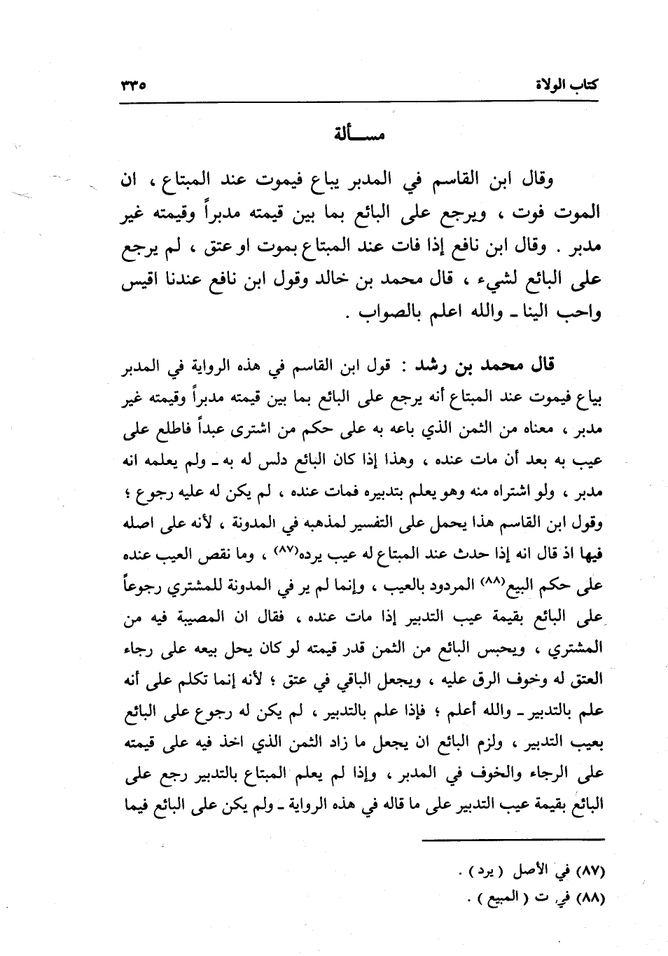 مسألة وقال ابن القاسم في المدبر يباع فيموت عند المبتاع، إن الموت فوت، ويرجع على البائع بما بين قيمته مدبرا وقيمته غير مدبر. وقال ابن نافع: إذا فات عند المبتاع بموت أو عتق، لم يرجع على البائع لشيء، قال محمد بن خالد: وقول ابن نافع عندنا أقيس وأحب إلينا - والله اعلم بالصواب.