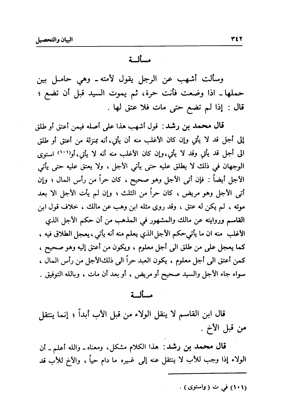 قال محمد بن رشد: قول أشهب هذا على أصله فيمن أعتق أو طلق إلى أجل قد لا يأتي وإن كان الأغلب منه أن يأتي، أنه بمنزلة من أعتق أو طلق إلى أجل قد يأتي وقد لا يأتي، وإن كان الأغلب منه أنه لا يأتي، أو استوى الوجهان في ذلك لا يطلق عليه حتى يأتي الأجل، ولا يعتق عليه حتى يأتي الأجل أيضا: فإن أتى الأجل وهو صحيح، كان حرا من رأس المال؛ وإن أتى الأجل وهو مريض، كان حرا من الثلث؛ وإن لم يأت الأجل إلا بعد موته، لم يكن له عتق، وقد روى مثله ابن وهب عن مالك، خلاف قول ابن القاسم وروايته عن مالك والمشهور في المذهب من أن حكم الأجل الذي الأغلب منه أن ما يأتي حكم الأجل الذي يعلم منه أنه يأتي، يعجل الطلاق فيه، كما يعجل على من طلق إلى أجل معلوم، ويكون من أعتق إليه وهو صحيح، كمن أعتق إلى أجل معلوم، يكون العبد حرا إلى ذلك الأجل من رأس المال، سواء جاء الأجل والسيد صحيح أو مريض، أو بعد أن مات، وبالله التوفيق.