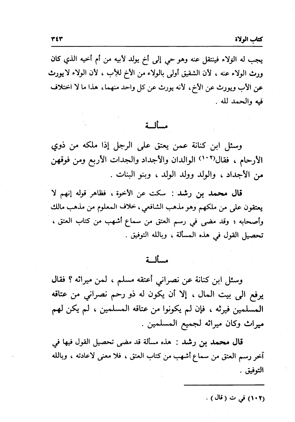 مسألة وسئل ابن كنانة عن نصراني أعتقه مسلم، لمن ميراثه؟ فقال: يرفع إلى بيت المال، إلا أن يكون له ذو رحم نصراني من عتاقه المسلمين فيرثه، فإن لم يكونوا من عتاقه المسلمين، لم يكن لهم ميراث وكان ميراثه لجميع المسلمين.