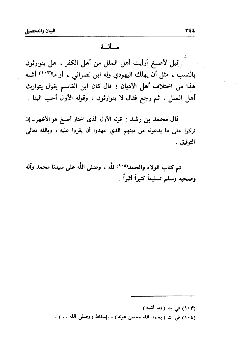 مسألة قيل لأصبغ: أرأيت أهل الملل من أهل الكفر، هل يتوارثون بالنسب، مثل أن يهلك اليهودي وله ابن نصراني، أو ما أشبه هذا من اختلاف أهل الأديان؛ قال: كان ابن القاسم يقول: يتوارث أهل الملل، ثم رجع فقال: لا يتوارثون، وقوله الأول أحب إلينا.