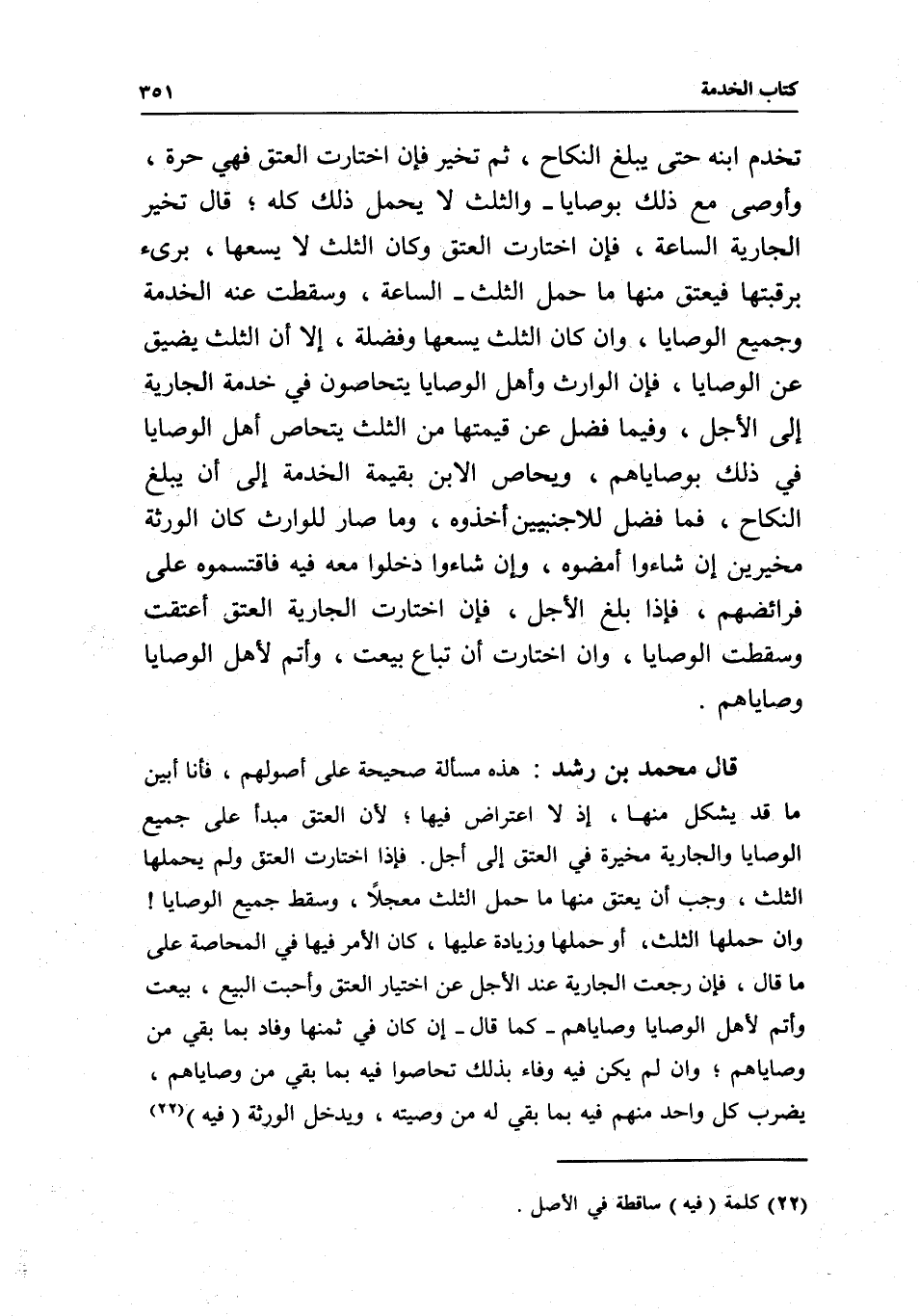 قال محمد بن رشد: هذه مسألة صحيحة على أصولهم، فأنا أبين ما قد يشكل منها، إذ لا اعتراض فيها؛ لأن العتق مبدأ على جميع الوصايا والجارية مخيرة في العتق إلى أجل. فإذا اختارت العتق ولم يحملها الثلث، وجب أن يعتق منها ما حمل الثلث معجلا، وسقط جميع الوصايا! وإن حملها الثلث، أو حملها وزيادة عليها، كان الأمر فيها في المحاصة على ما قال، فإن رجعت الجارية عند الأجل عن اختيار العتق وأحبت البيع، بيعت وأتم لأهل الوصايا وصاياهم- كما قال- إن كان في ثمنها وفاء بما بقي من وصاياهم؛ وإن لم يكن فيه وفاء بذلك تحاصوا فيه بما بقي من وصاياهم، يضرب كل واحد منهم فيه بما بقي له من وصيته، ويدخل الورثة (فيه)