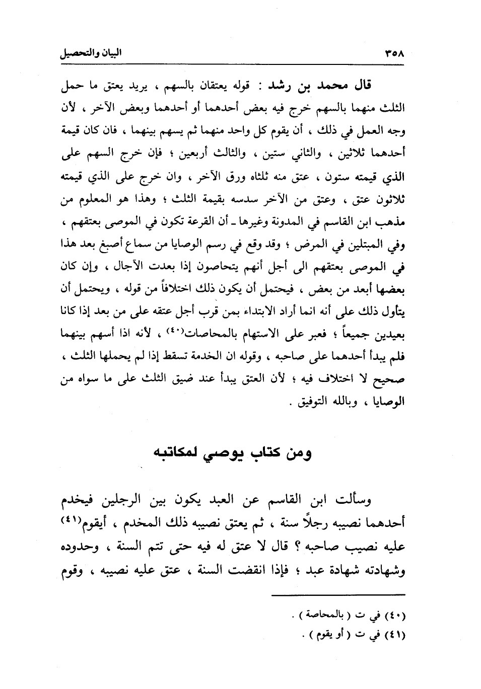 قال محمد بن رشد: قوله يعتقان بالسهم، يريد يعتق ما حمل الثلث منهما بالسهم خرج فيه بعض أحدهما أو أحدهما وبعض الآخر، لأن وجه العمل في ذلك، أن يقوم كل واحد منهما ثم يسهم بينهما، فإن كان قيمة أحدهما ثلاثين، والثاني ستين، والثالث أربعين؛ فإن خرج السهم على الذي قيمته ستون، عتق منه ثلثاه ورق الآخر، وإن خرج على الذي قيمته ثلاثون عتق، وعتق من الآخر سدسه بقيمة الثلث؛ وهذا هو المعلوم من مذهب ابن القاسم في المدونة وغيرها- أن القرعة تكون في الموصى بعتقهم، وفي المبتلين في المرض؛ وقد وقع في رسم الوصايا من سماع أصبغ بعد هذا في الموصى بعتقهم إلى أجل أنهم يتحاصون إذا بعدت الآجال، وإن كان بعضها أبعد من بعض، فيحتمل أن يكون ذلك اختلافا من قوله، ويحتمل أن يتأول ذلك على أنه إنما أراد الابتداء بمن قرب أجل عتقه على من بعد إذا كانا بعيدين جميعا، فعبر على الاستهام بالمحاصات، لأنه إذا أسهم بينهما فلم يبدأ أحدهما على صاحبه، وقوله: إن الخدمة تسقط إذا لم يحملها الثلث، صحيح لا اختلاف فيه؛ لأن العتق يبدأ عند ضيق الثلث على ما سواه من الوصايا، وبالله التوفيق.