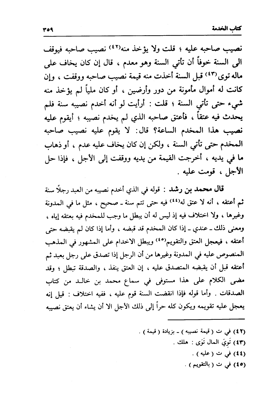 نصيب صاحبه عليه؛ قلت: ولا يؤخذ منه نصيب صاحبه فيوقف إلى السنة خوفا أن تأتي السنة وهو معدم، قال: إن كان يخاف على ماله توى قبل السنة أخذت منه قيمة نصيب صاحبه ووقفت، وإن كانت له أموال مأمونة من دور وأرضين، أو كان مليا لم يؤخذ منه شيء حتى تأتي السنة؛ قلت: أرأيت لو أنه أخدم نصيبه سنة فلم يحدث فيه عتقا، فأعتق صاحبه الذي لم يخدم نصيبه؛ أيقوم عليه نصيب هذا المخدم الساعة؟ قال: لا يقوم عليه نصيب صاحبه المخدم حتى تأتي السنة، ولكن إن كان يخاف عليه عدم، أو ذهاب ما في يديه، أخرجت القيمة من يديه ووقفت إلى الأجل، فإذا حل الأجل، قومت عليه.