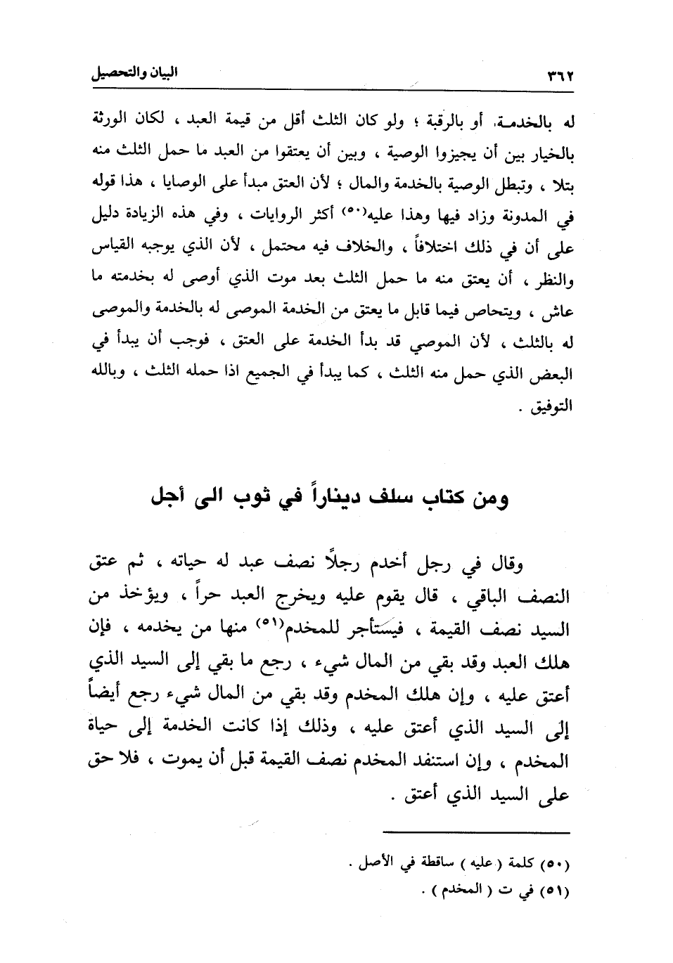 ومن كتاب سلف دينارا في ثوب إلى أجل وقال في رجل أخدم رجلا نصف عبد له حياته، ثم عتق النصف الباقي، قال: يقوم عليه ويخرج العبد حرا، ويؤخذ من السيد نصف القيمة، فيستأجر للمخدم منها من يخدمه، فإن هلك العبد وقد بقي من المال شيء، رجع ما بقي إلى السيد الذي أعتق عليه، وإن هلك المخدم وقد بقي من المال شيء رجع أيضا إلى السيد الذي أعتق عليه، وذلك إذا كانت الخدمة إلى حياة المخدم، وإن استنفد المخدم نصف القيمة قبل أن يموت، فلا حق على السيد الذي أعتق.
